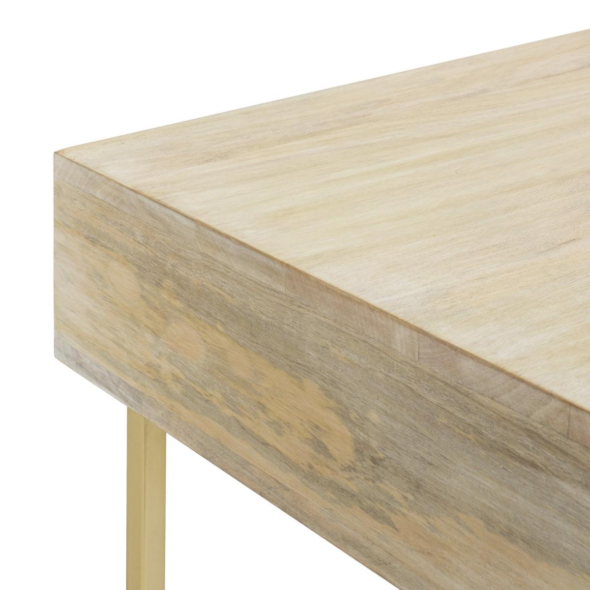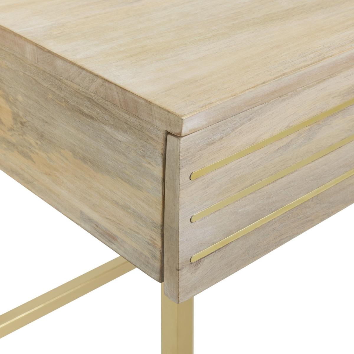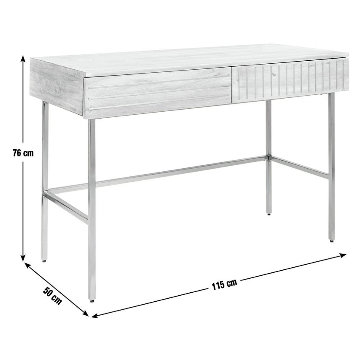 Who's for a practical desk with a gleaming luxe touch? Thought so. Samara has more than its fair share of glamour. Inlays of golden steel are artistically bonded into whitewashed mango wood. With plenty of space on top for a computer and 2 easy-glide drawers for stationery and essentials. Golden handles and legs complete the look. Part of the Samara collection. Made from solid wood and steel. 2 drawers with wooden runners. Easy cable access. Self-assembly - 1 person recommended. Wall fixing recommended. If this product is over 60cm high it must be securely attached to the wall to prevent overturning. General information: Manufacturer's 1 year guarantee. Dimensions: Size H76, W115, D50cm. Maximum load capacity of desk 15kg. Weight 22.35kg. Packaged dimensions: Package dimensions H58, W122, D35.5cm.