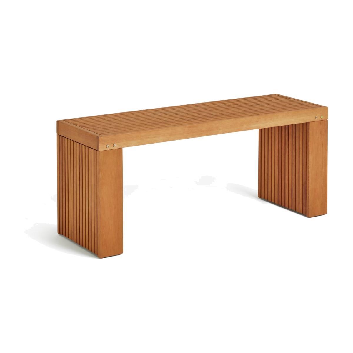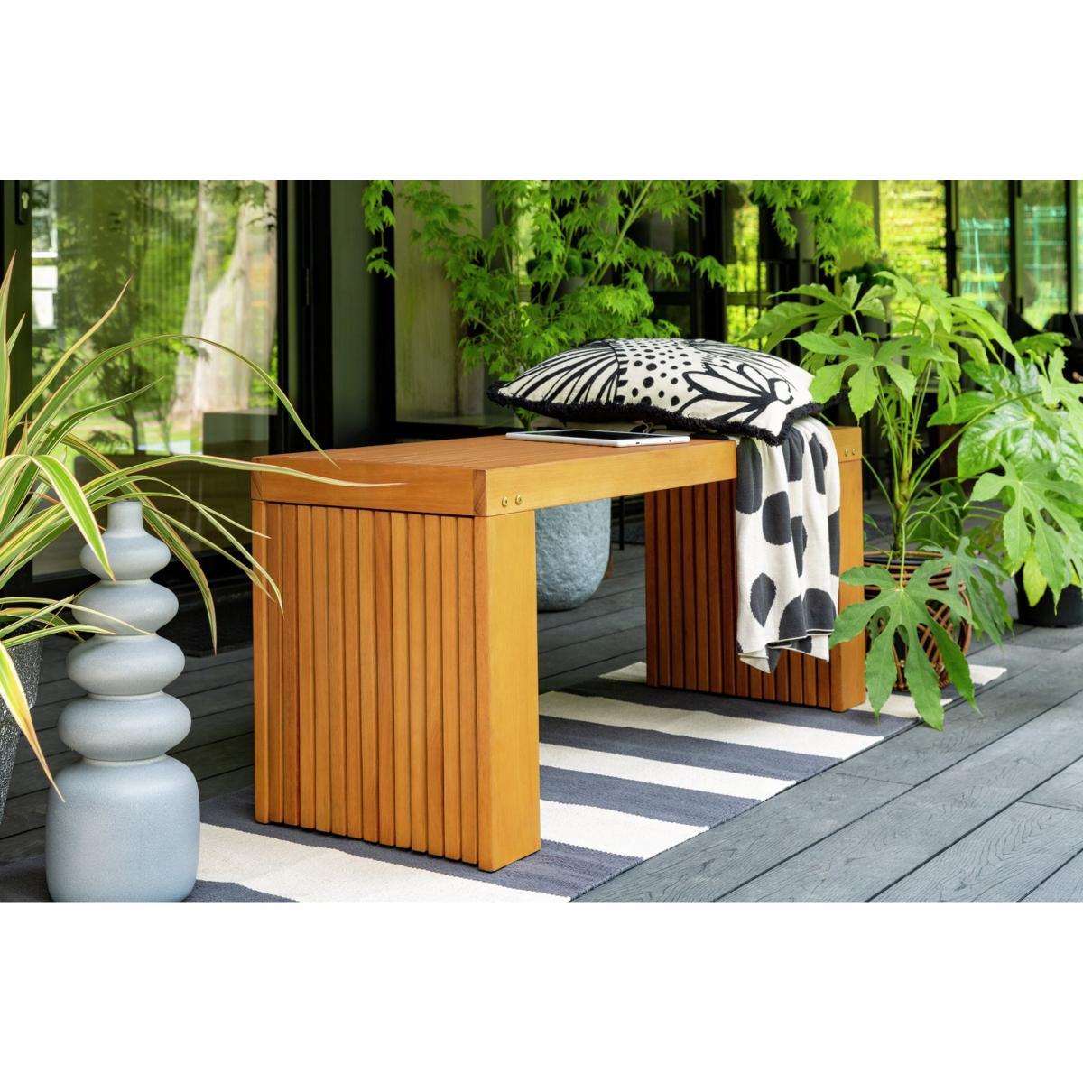 I love this garden bench for its clean, minimalist design and the natural light eucalyptus wood, which adds warmth without feeling overly traditional. It works particularly well in modern or Scandinavian-inspired interiors where simplicity and natural materials are key. For practical styling, consider pairing it with outdoor cushions in earthy tones or placing it alongside a matching dining set for a cohesive look. Inside, it can be used as a statement piece in minimalist hallways or sunrooms, adding an inviting functional touch while maintaining a fresh, airy feel.