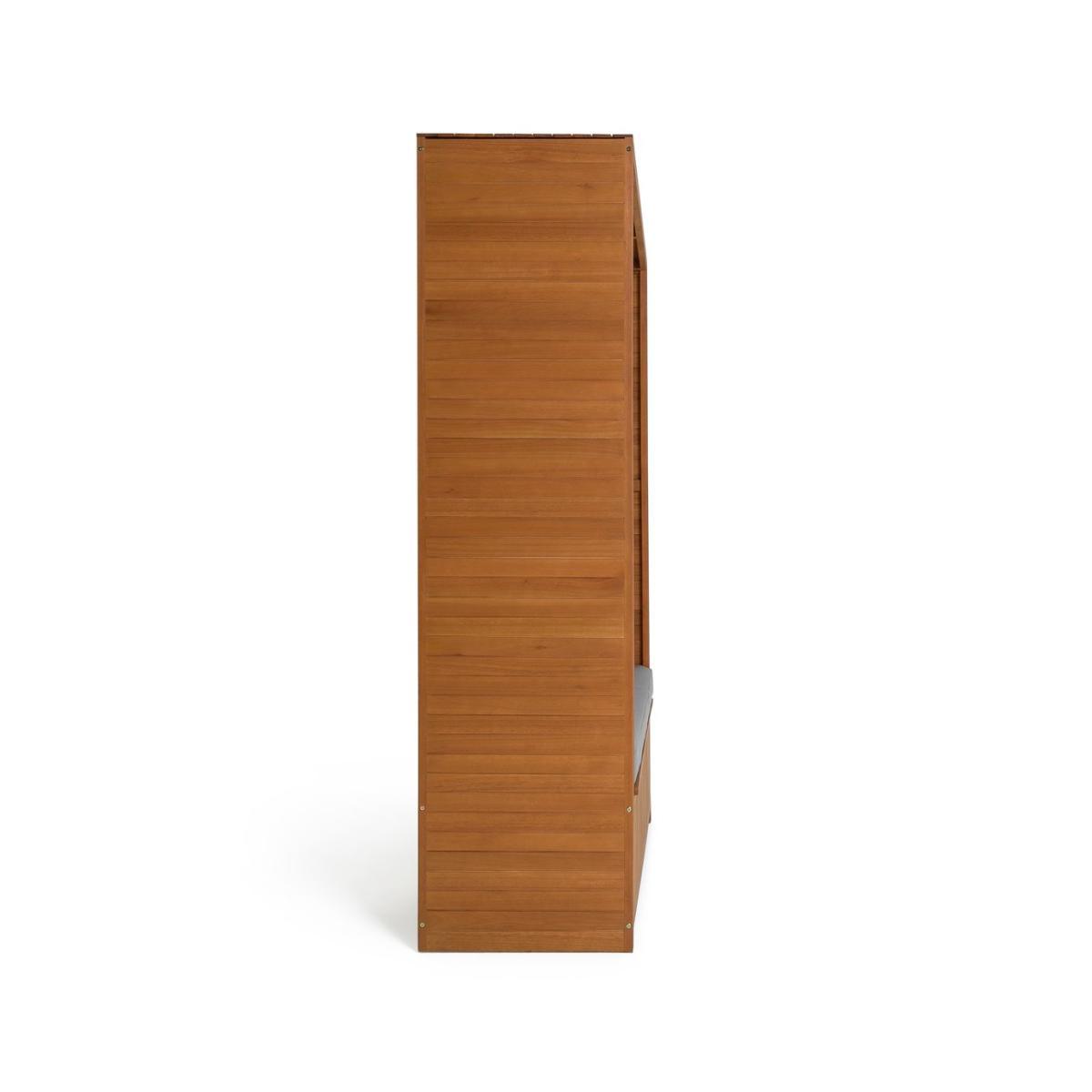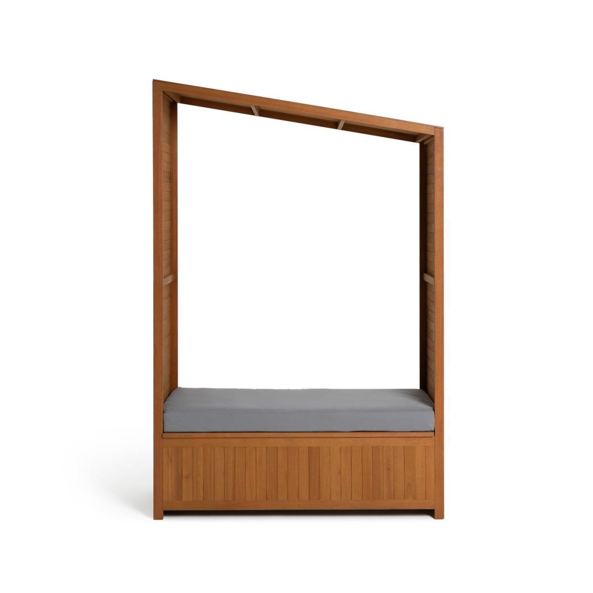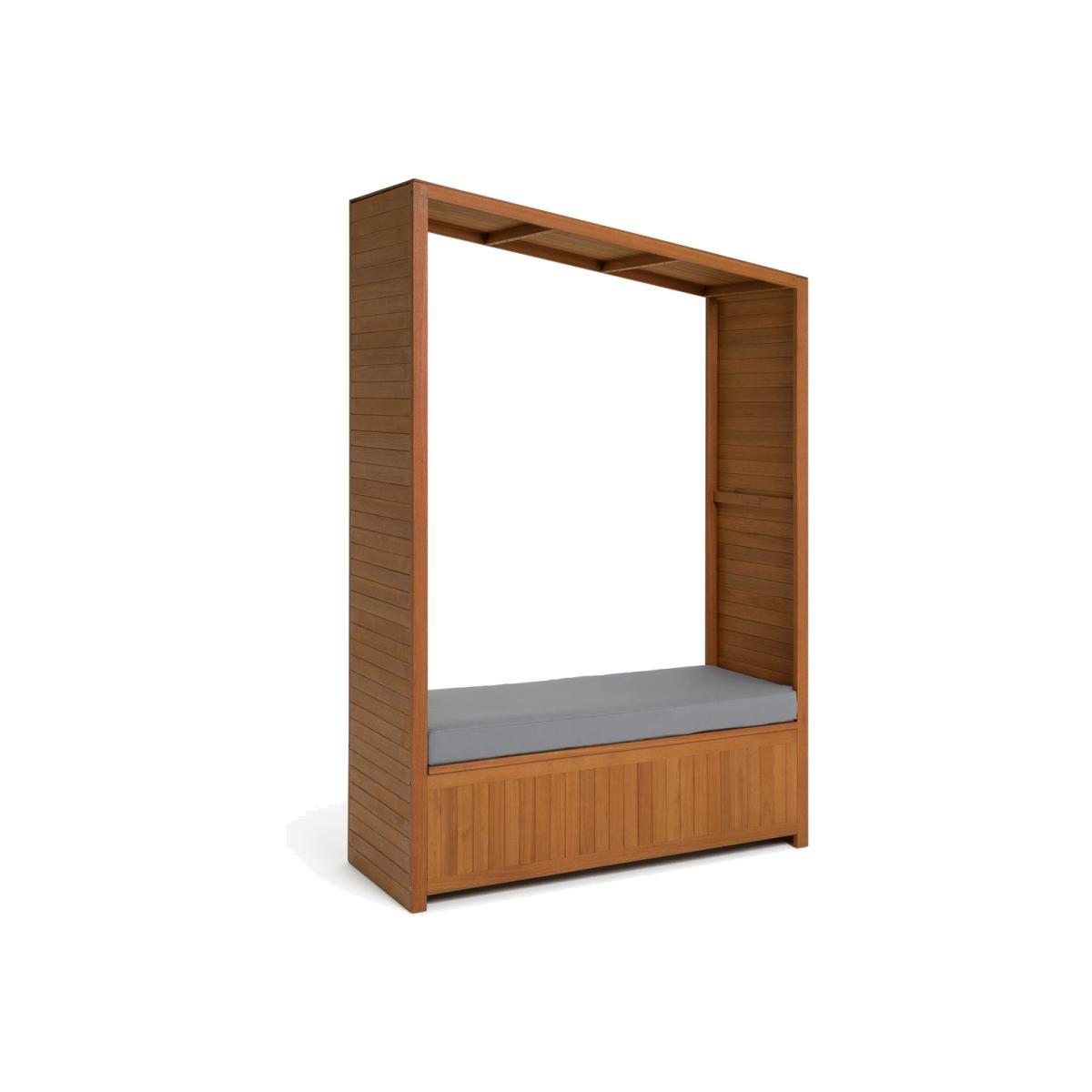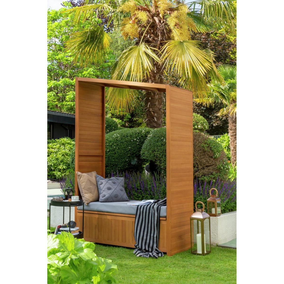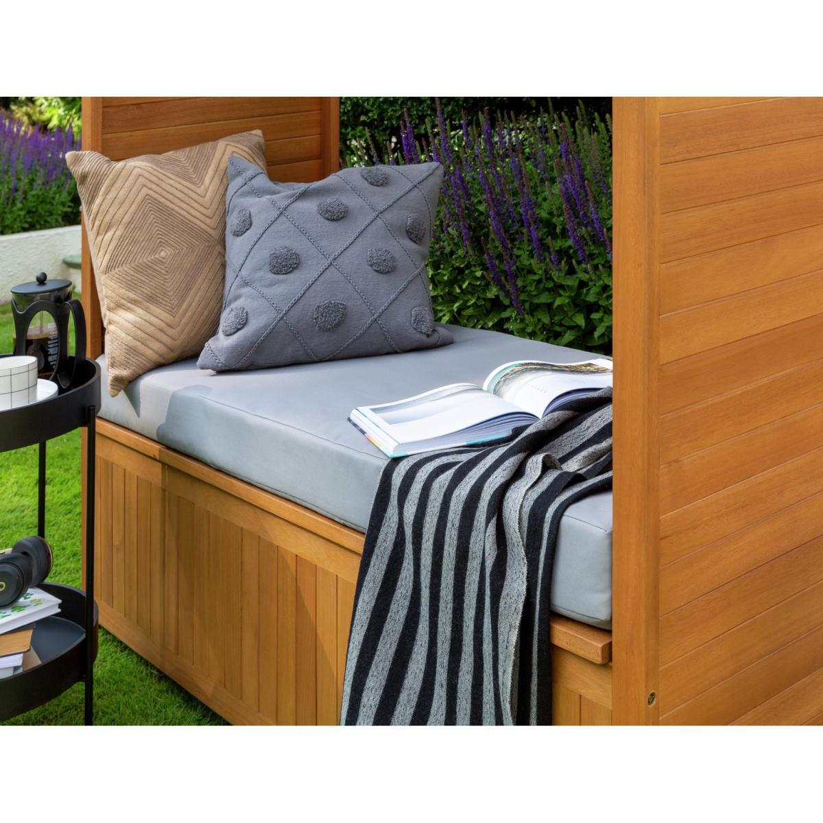 Outdoor living at its best. The striking design of our modern arbor gives this garden seating the wow factor. It's a wonderful way to extend your space from inside to out. Crafted from naturally weather-proof Eucalyptus, this 3-seater storage bench looks stunning on a patio or nestled amongst lush planting. We love the thickly padded cushion and rich wood finish. Ample storage underneath the bench seat. Spot of summer rain? Just lift the seat and stow everything in seconds. That's clever. A contemporary cocoon of relaxation.