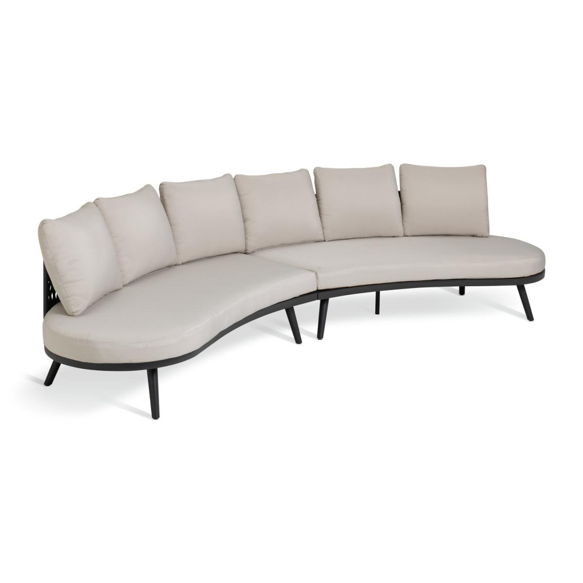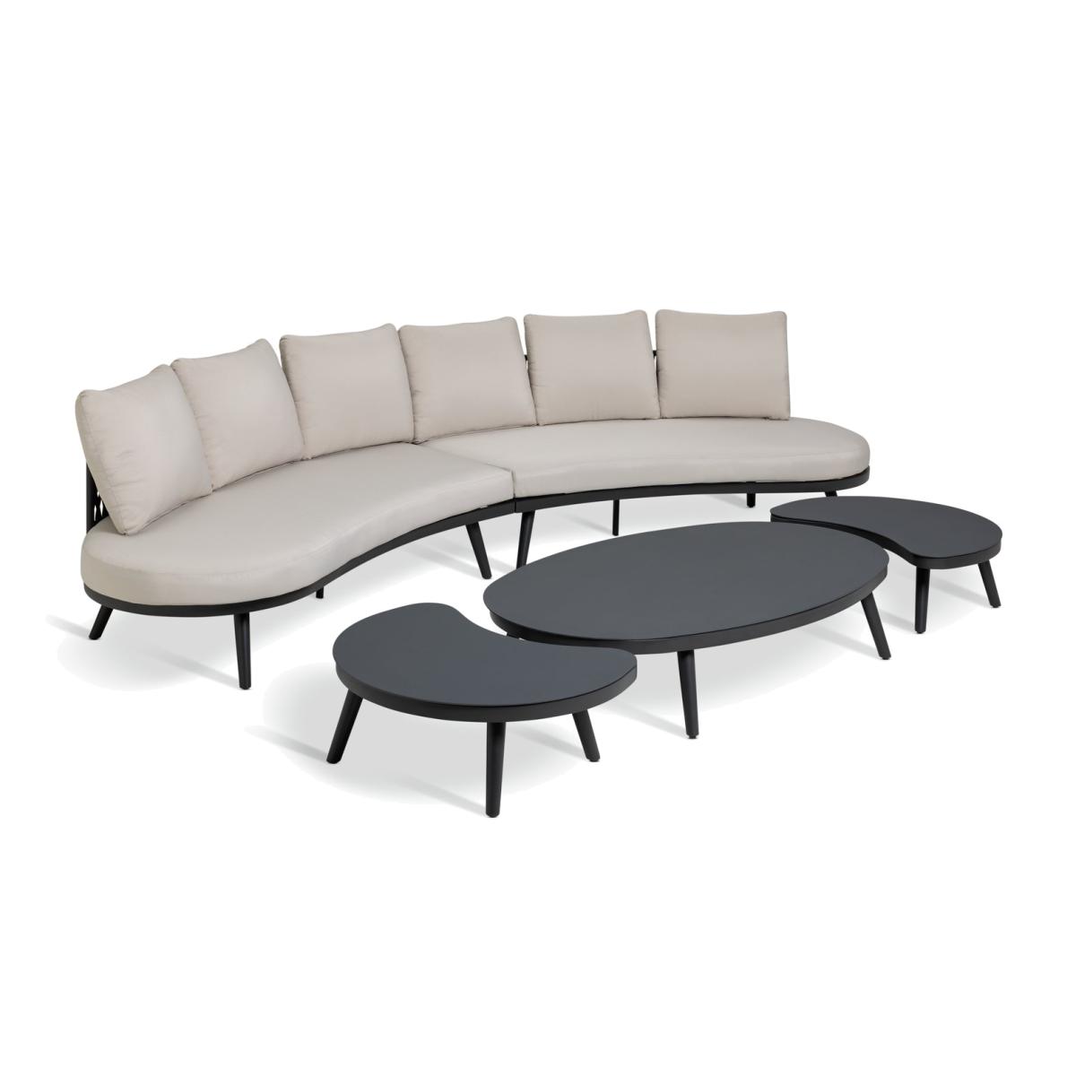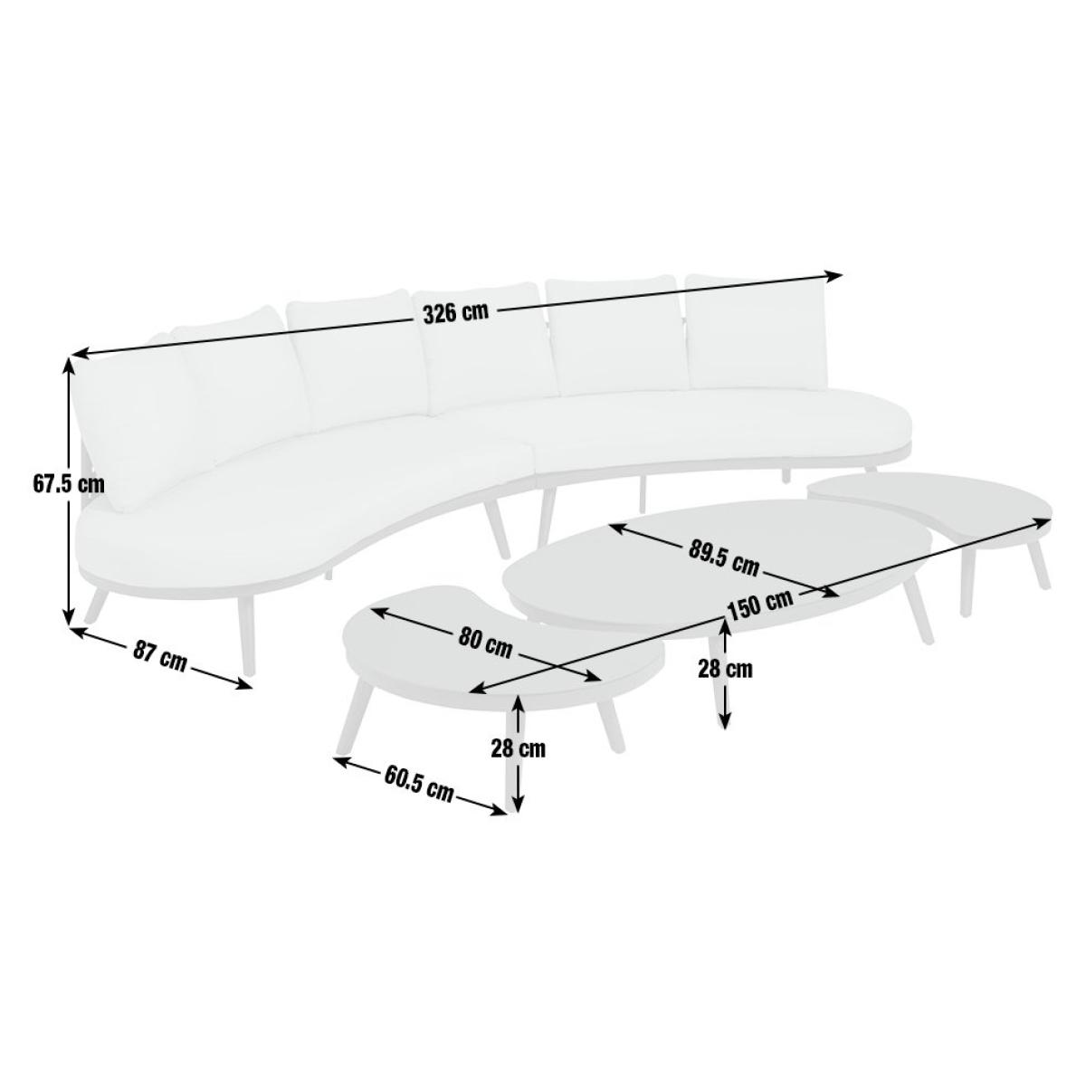 Like relaxing outdoors? Then you'll love Santorini. Our large, curved modular sofa set with an array of fit together, or stand alone, occasional tables. Able to seat up to 6, the set comes in an attractive and robust metal and rattan weave effect. On the sofa you'll find 8, made-to-fit, thick and soft cushions in a beige textured weave. Perfect for lounging on. Sitting on black splayed legs, Santorini is a set that draws an instant wow factor from family and friends. The best seat in the garden no doubt. Part of the Santorini collection. Parasol not included. Includes 8 cushions. General features: Set seats 6 people. Set made from metal and rattan effect. Store inside when not in use. Cover or store inside in winter months to prolong life of the products. Total weight 86kg. Garden table features: Glass table top. Table size: H28, W150, L89.5cm. Chair features: Chair seat and back made from steel. Size H67.5, W183, D87cm. Seat height 38cm. Seating area size W 185.5, D87.5cm. 220kg maximum user weight per chair. Sofa features: Sofa size H67.5, W326. D87cm. 550kg maximum user weight per sofa. Cushion features: Recycle Solution dye polyester and Beige cushions. Removable covers. Washable covers. Remove cushions when not in use and store inside. Packaging information: Package 1 size H12, W156, D97.5cm. Package 1 weight 43.9kg. Package 2 size H53.5, W188, D107cm. Package 2 weight 61.2kg. General Information: Self-assembly - 2 people required. Manufacturer's 1 year guarantee.