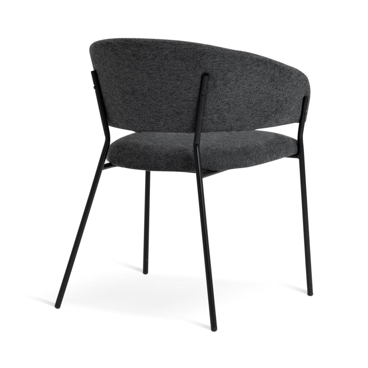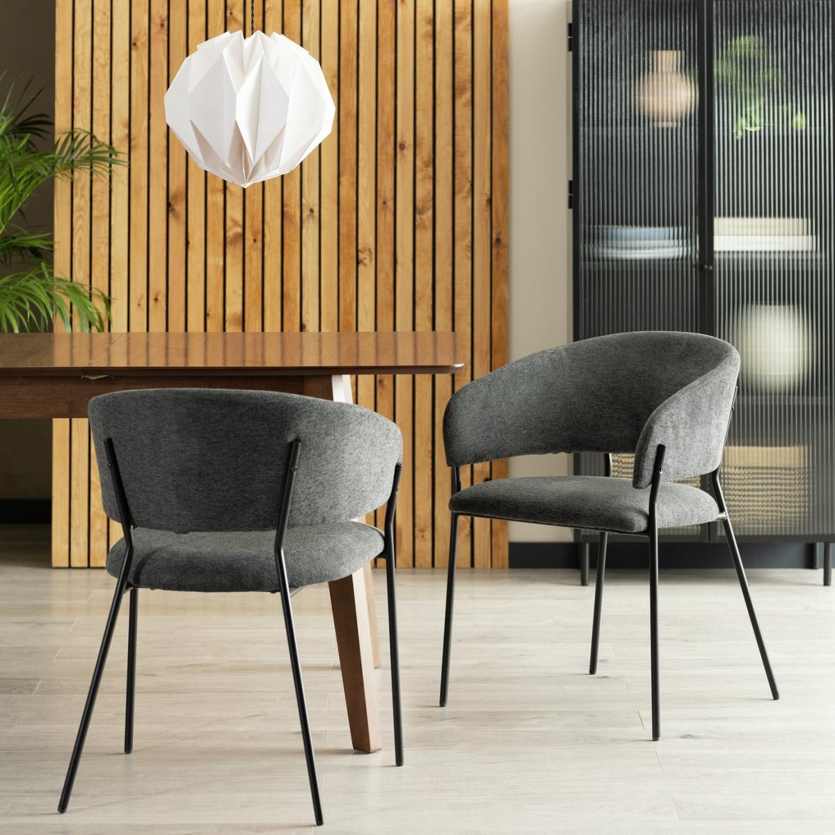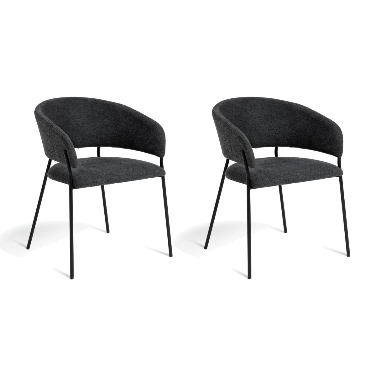 Meet our modern dining chair duo. Our pair of Sawyer chairs are upholstered in textured charcoal grey fabric with wrap-around backs, plushly padded seats and stylish splayed legs that add a contemporary edge. Part of the Sawyer collection. Chair: 2 chairs supplied. Size H77, W57, D57cm. Seat height 49cm. Metal frame with metal legs. Fabric seat pad. Self-assembly - 1 person recommended. Max user weight per chair 130kg. Individual chair weight 6.4kg. Wipe clean with a damp cloth. Package Dimensions: Chair package size: H71, W59, D55cm. General information: Manufacturer's 1 year guarantee. FSC certified meaning the materials used for this product are responsibly sourced.