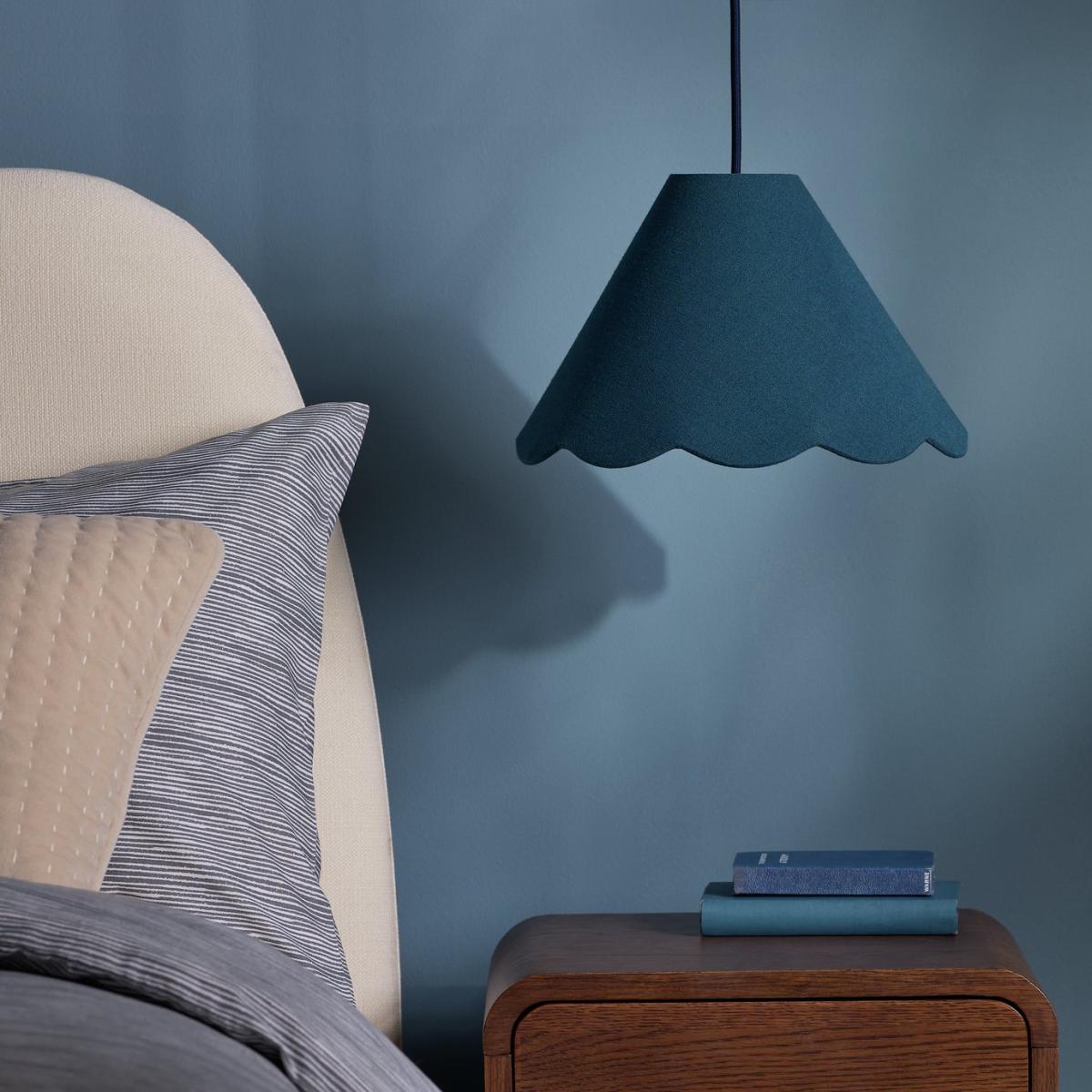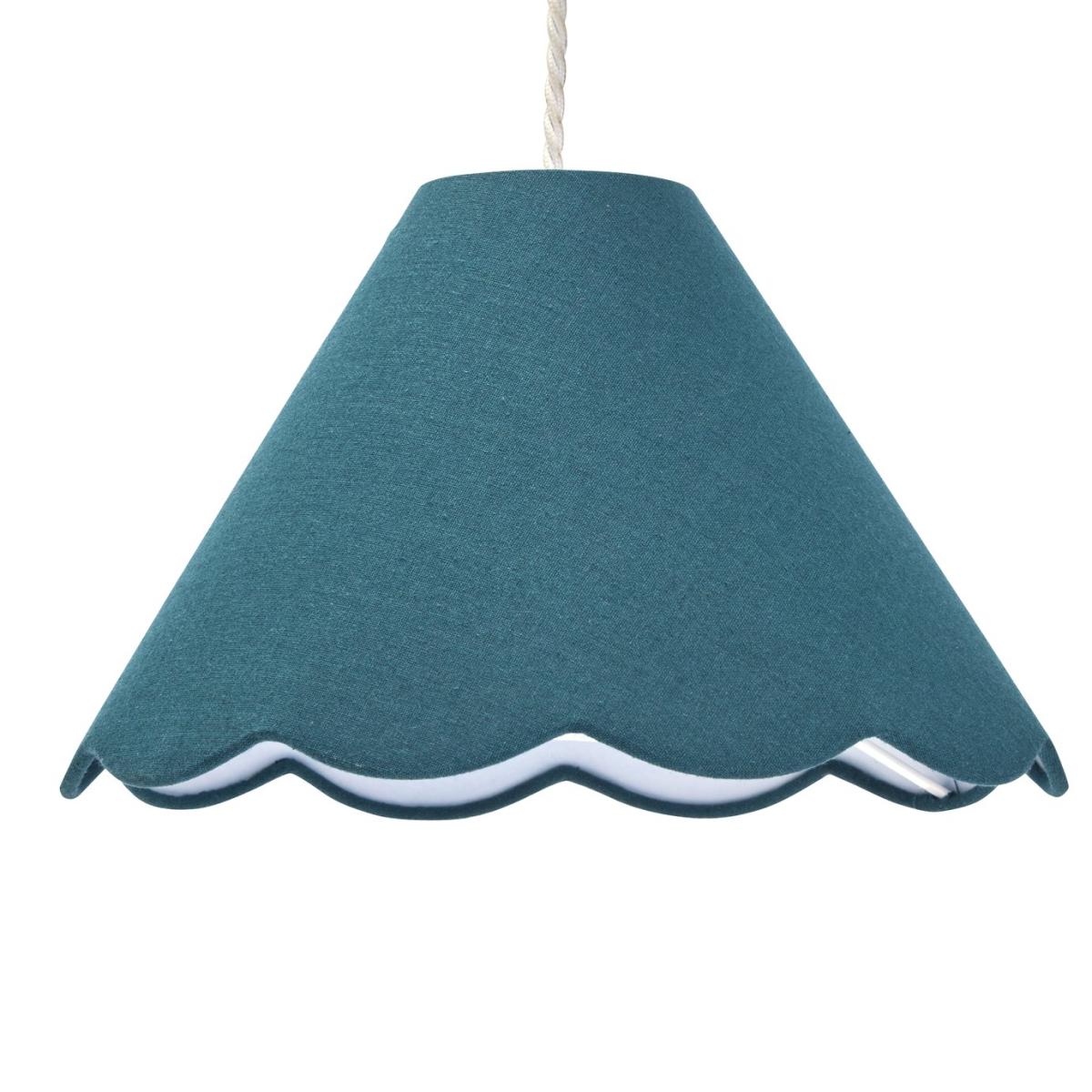 Add a softer accent to any room with this scalloped shade. Suitable for both pendant fittings and table lamps, it offers a fresh new take on a classic tapered shape. Its wavy edge gives a nod to vintage design while the inky blue hue brings in an understated depth. Simply delightful. Scallop edge shade with reversal gimble can fit ceiling lamp and table lamp. Made from polyester. Size H19.5cm, W32cm, D32cm. Diameter 32cm. Fully assembled. Easy fit shade. Manufacturer's 1 year guarantee.