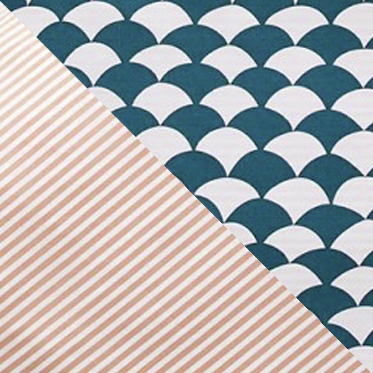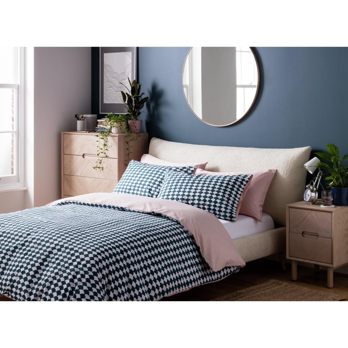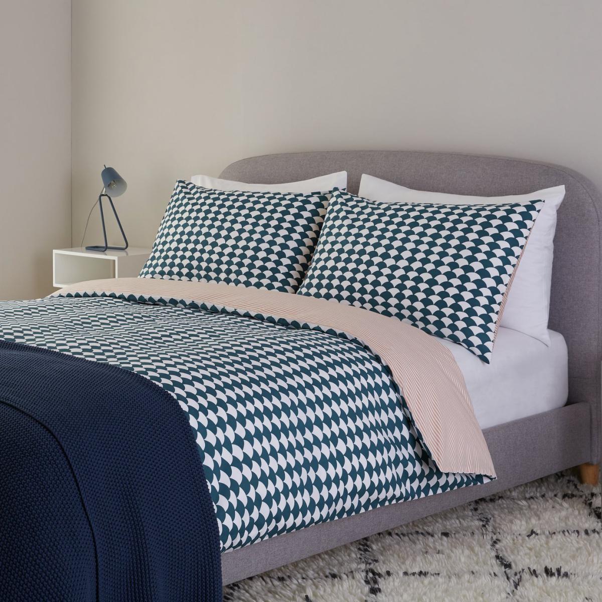 Designer's delight. Our Scallop bedlinens feature a teal scallop graphic on one side and a pink pinstripe on the other. 100% cotton and a 180-thread count make them cosy to sink down into at the end of the day. A true design classic, Scallop fits with any decor style from Scandi to modern to country house. And this great value super king set comes with 2 pillowcases and a duvet cover. Reverse it. Scallop is reversible and either side brings a dose of cool style to your bedroom and looks great in either a boy's or a girl's bedroom. Finish off the look with a contrasting throw blanket and smart table lamps and you've got a bedroom that begs to be Instagrammed. Set includes 1 duvet cover and 2 pillowcases. 180 thread count. 30. C machine washable. Cotton. Buttons for fastening.