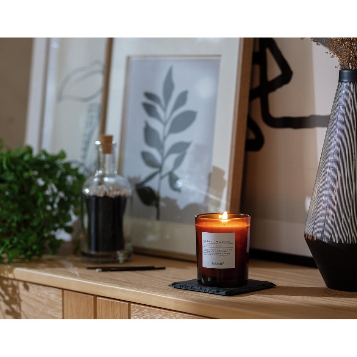 I love this one for adding a fresh, botanical touch to a variety of spaces. Its clean, modern packaging and subtle scent of geranium and basil make it versatile-perfect for kitchens, living rooms, or even bedrooms where a calming but invigorating aroma is desired. It works particularly well styled in natural materials like reclaimed wood, woven baskets, or marble surfaces, and looks great when grouped with other candles or greenery for a curated, layered look. For practical styling, consider placing it on a tray or a dedicated coffee table setting to prevent wax drips and keep it as a focal point that can be easily enjoyed when the mood strikes.
