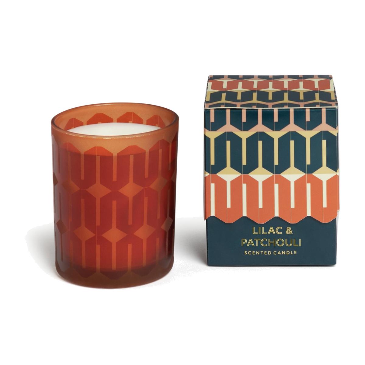 In the mood for something romantic? Light up our lilac & patchouli candle and let its floral and earthy aroma waft over you. With woody notes and a touch of spice it's a sensuous fragrance with rich depths. How relaxing. Looks striking too in its orange frosted glass holder with a funky wave pattern. Time to unwind. Beautifully packaged in a wave patterned box, it makes a thoughtful gift. Lilac & Patchouli scent. Paraffin wax. Approximate burn time 30 hours. Size H9, W7, D7cm. Diameter 7cm.