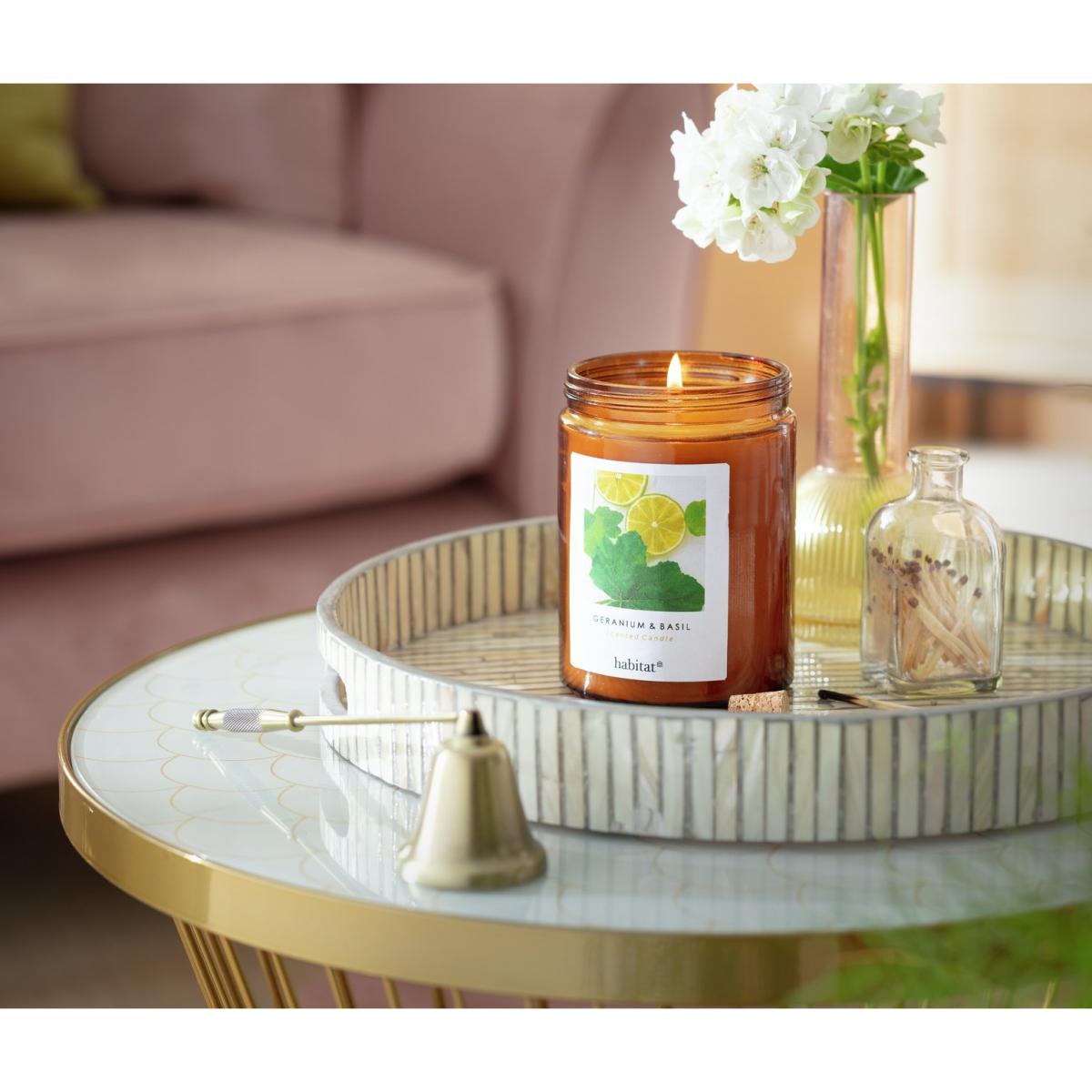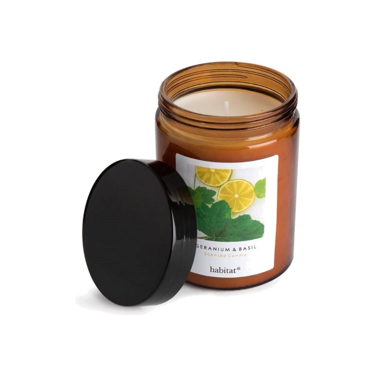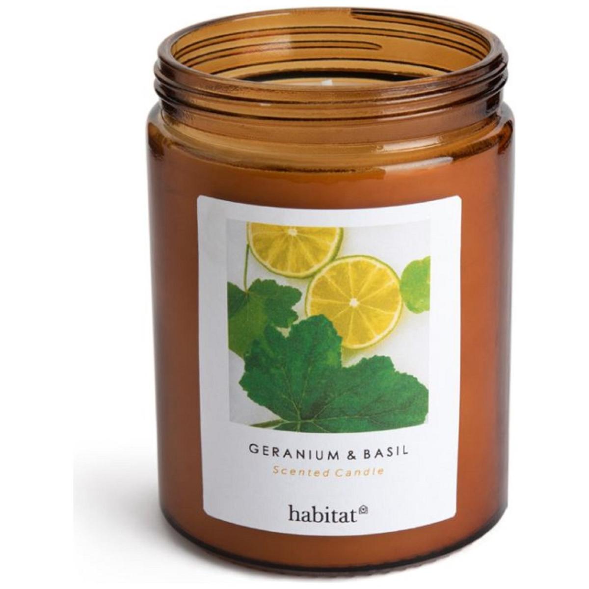 Fabulously floral. Scent of geranium meets a hint of basil in our scented candle. Delightful. Herbaceous notes blend seamlessly with a touch of citrusy spice to create a soft but potent fragrance. A real aromatic delight in a sweet brown glass jar with decorative label and lid. Just light and let the tantalizing scent fill your home. Want more? Check out our collection of scented candles and diffusers to find your favourite fragrances. Geranium & Basil scent. Paraffin wax. Approximate burn time 70 hours. Size H13, W9.2, D9.2cm. Diameter 9.2cm.