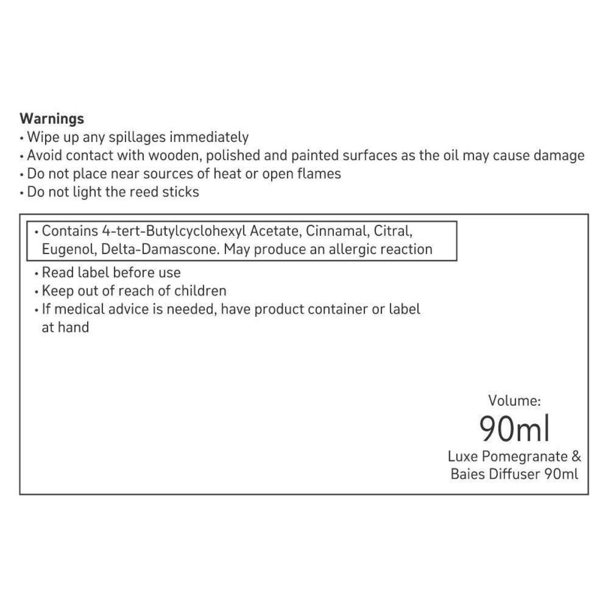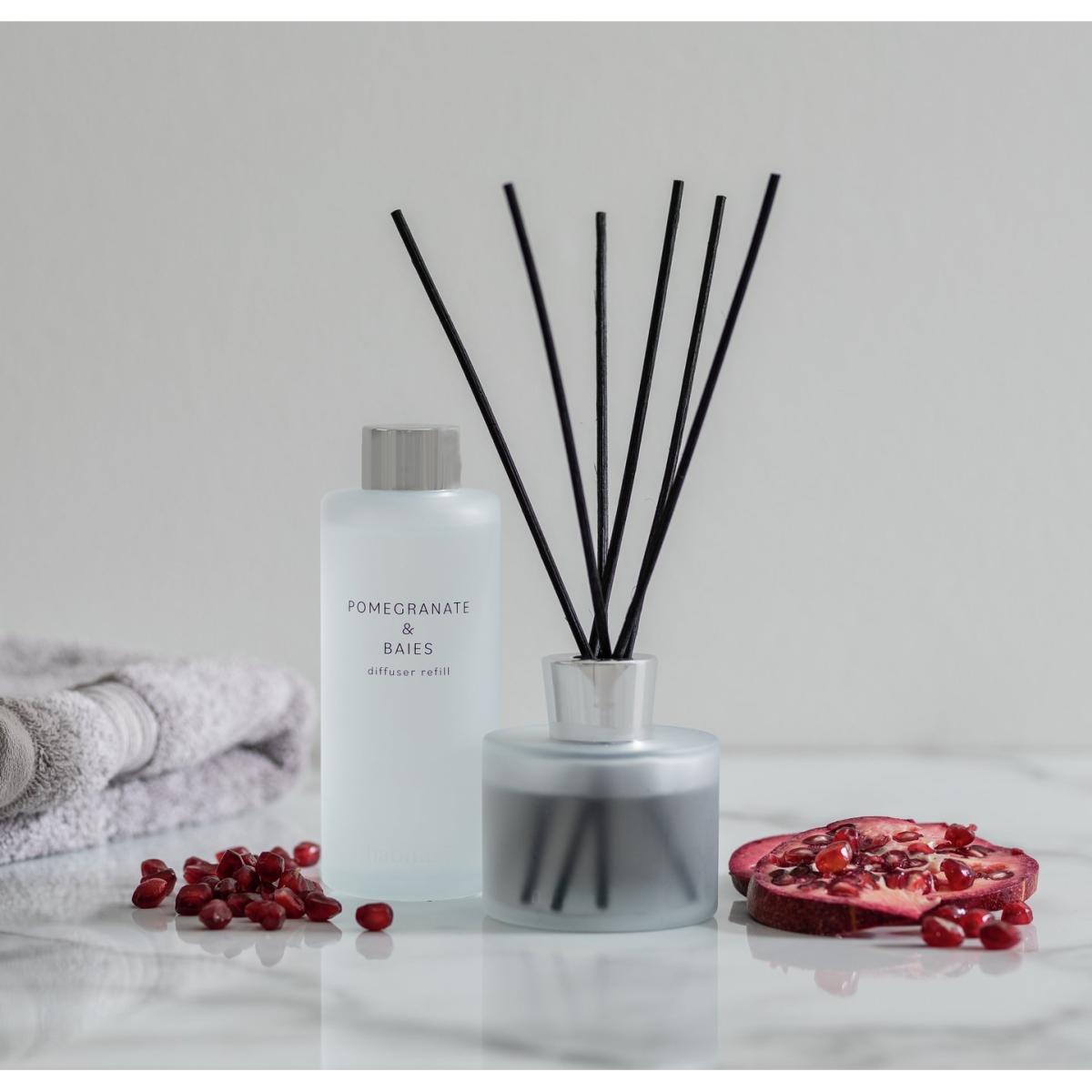 A welcoming scent for your senses. Bring a fruity feel to your home with our fragrant diffuser. Enjoy notes of energising Pomegranate mingled with subtle floral Baies. Comes in a glass bottle with black rattan reeds. Pomegranate & Baies scent. Reed Material: Rattan. Includes diffuser bottle, reeds, fragrance. 90ml capacity. Size H24, W8.5, D8.5cm.
