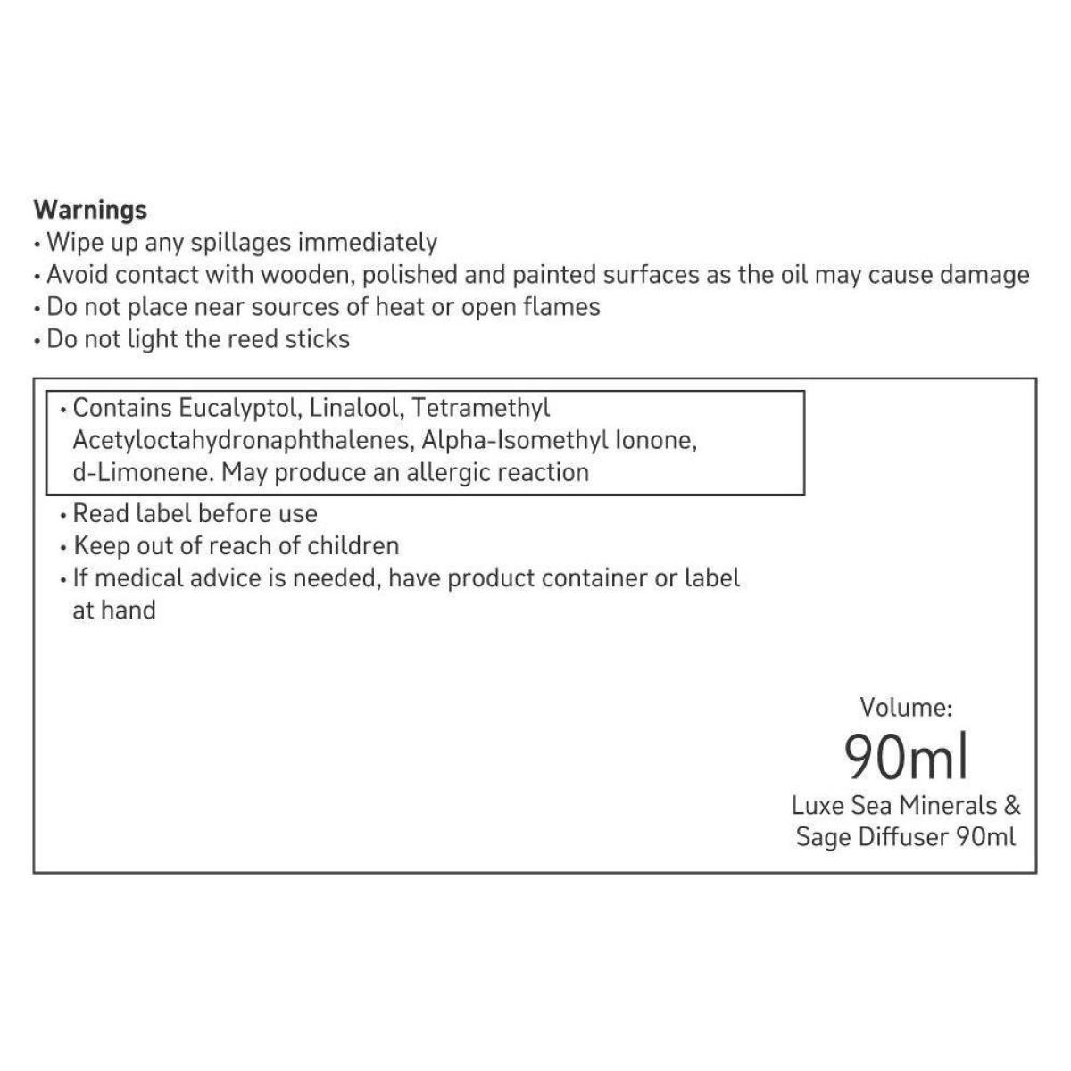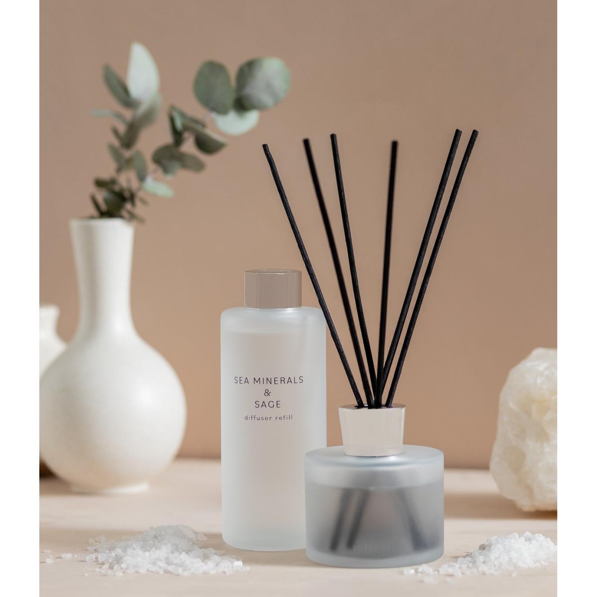 As fresh as a coastal breeze, our Sea Minerals and Sage scented diffuser is an invigorating fragrance. Comes in a frosted glass bottle with black reeds. Sea Minerals & Sage scent. Reed Material: rattan. Includes diffuser bottle, reeds, fragrance. 90ml capacity. Size H24, W8.5, D8.5cm.