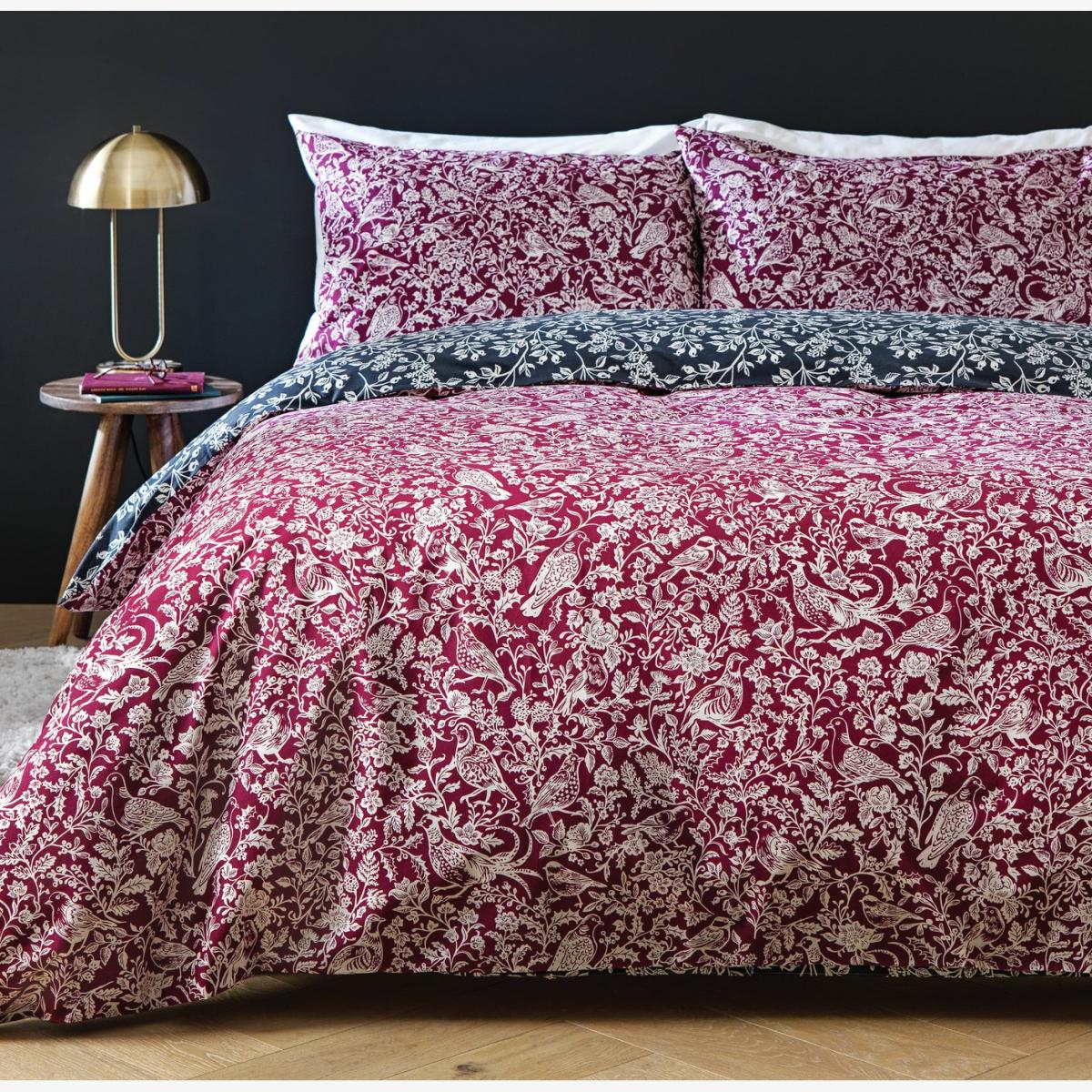 Designed for snuggly nights. A rich, wintery pattern of wild birds and foliage in traditional seasonal colours, makes this single bedding set warmly inviting. Reversible too. The other side showcases white foliage on a dark grey background. Made from soft, long lasting polycotton, it will keep your bed well dressed for many winters to come. What else would make those long dark nights feel more cosy? Feather your nest with a new rug, blinds or curtains. Finish: woven. 52% polyester , 48% cotton. Set includes 1 duvet cover and 1 pillowcase. Bed size: single. Length 200cm, Width 135cm. Reversible. Standard pillowcase (s). Pillow case length 75cm, Width 50cm. Machine washable at low temperature. Suitable for tumble drying.
