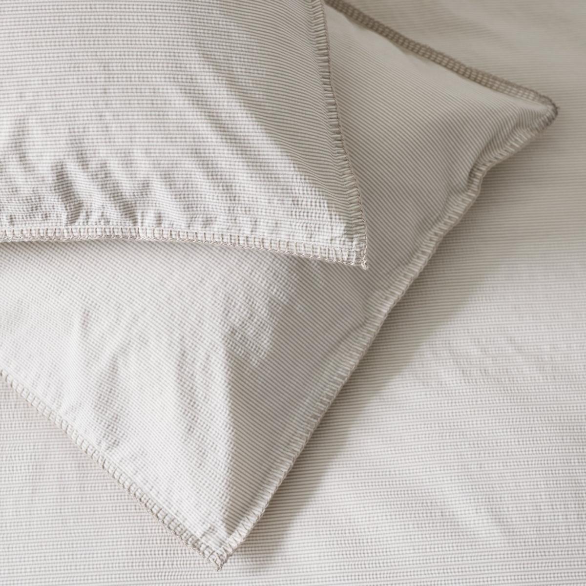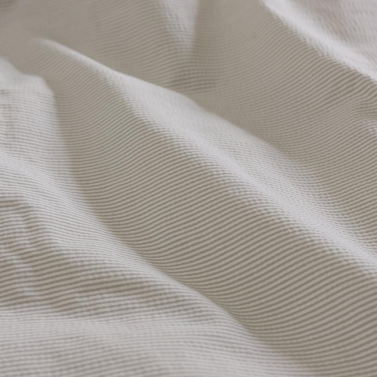 Settle in for the night with this striped seersucker super king size bedding set. Puffy and patterned, it'll add dimension to your bedroom. Finished in tactile blanket stitching for that boho rustic look. Just what you need for the cosy cottage core look of your dreams. Fabric finish: percale. 52% recycled polyester, 48% cotton. 144 thread count. Set includes 1 duvet cover and 2 pillowcases. Bed size: super king. Length 220cm, Width 260cm. Reversible. Buttons for fastening. Standard pillowcase (s). Pillowcase length 75cm, Width 50cm. Machine washable at 40 C. Suitable for tumble drying.