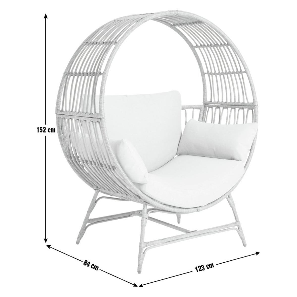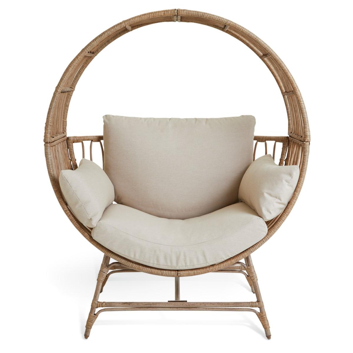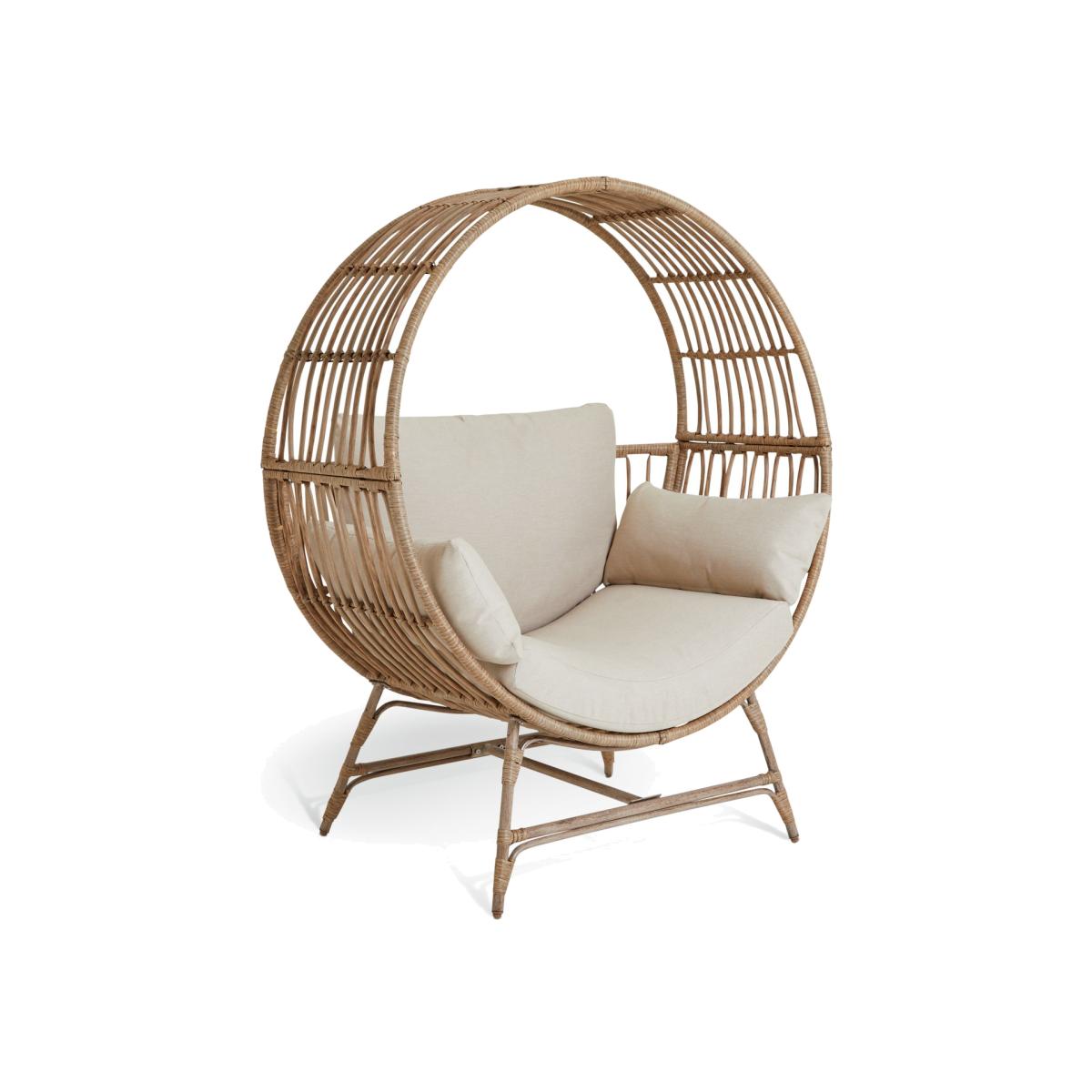 Settle into the inviting curves of this egg chair. Its rattan-effect frame forms a cocoon-like silhouette, designed to cradle you in style. The soft, cream cushions are tailored for a snug fit. Blending natural textures with contemporary durability, this piece is a stylish addition for relaxed outdoor lounging. Steel frame. Chair seat and back made from polyester. Cushions: Polyester cushion cover. Removable cushions. Cushions are shower proof, but should be stored inside when not in use. Dimensions: Size H152, W123, D84cm. Weight 23.5kg. Seat height from ground 46cm. Seating area size W66, D68.5cm. Maximum user weight 110kg. Package Dimensions: Package 1 dimensions: H54.5, W119.5, D71cm. Package 1 weight:30.2kg. General information: Self-assembly - 2 people required. Store inside when not in use. Cover or store inside in winter months to prolong life of product. Manufacturer's 1 year guarantee.