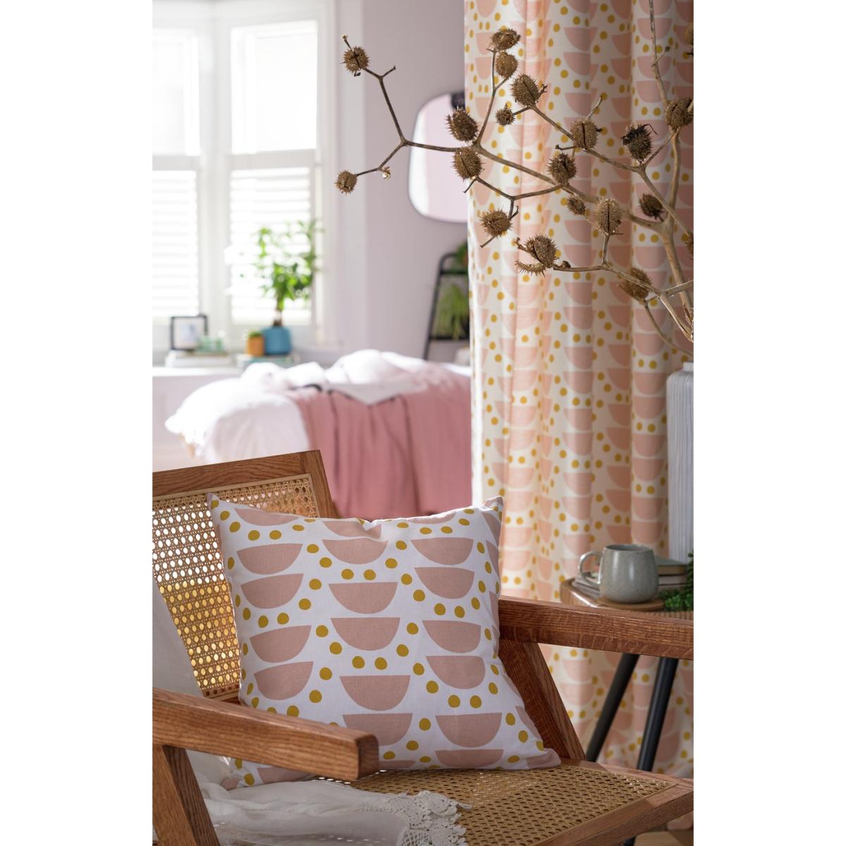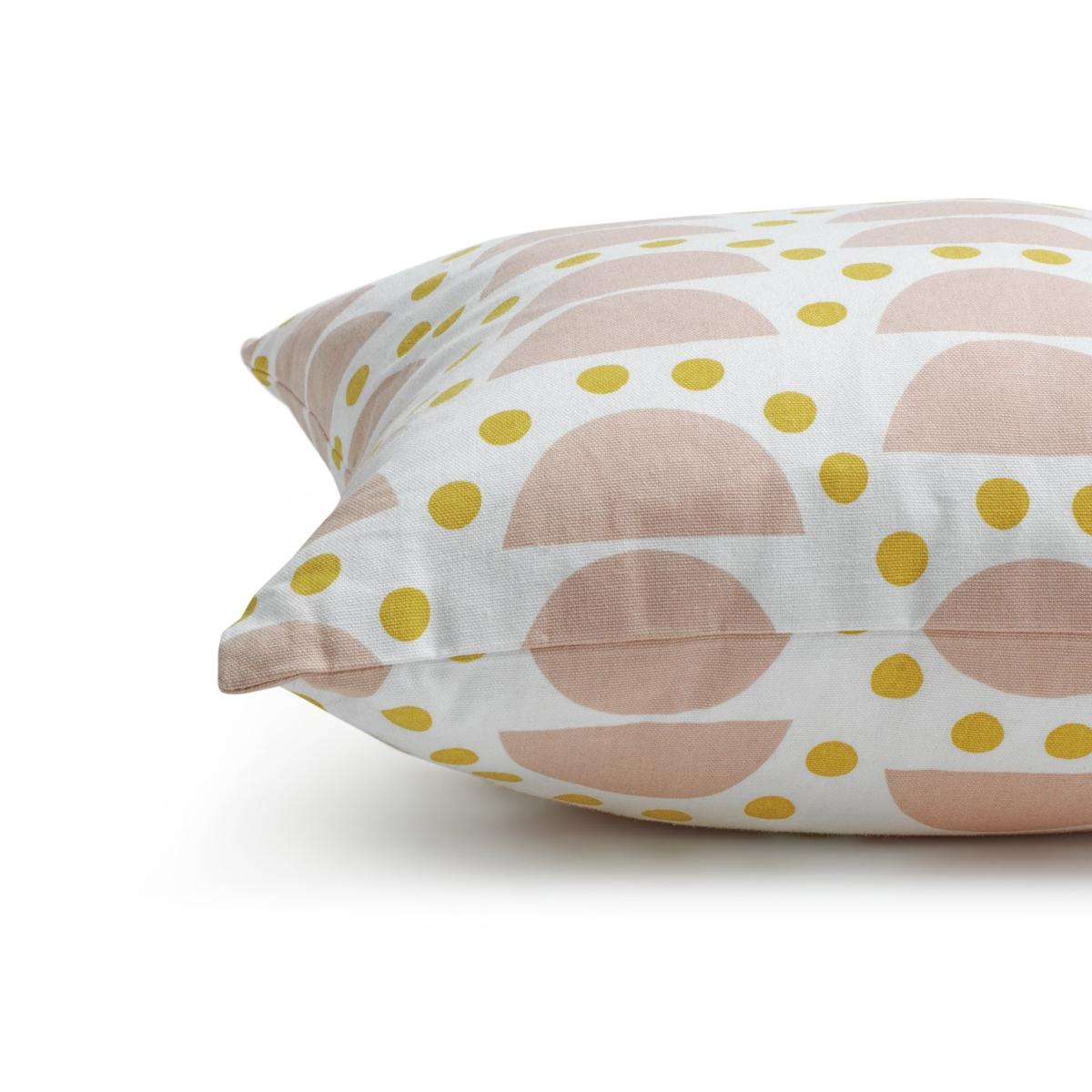 Settle in with our joyfully geometric cushion. Fresh and lively, its mustard spots and blush pink semicircles pop against the white background. It's an easy way to liven up a look. 100% cotton with a removable cover. A cushion with charisma.