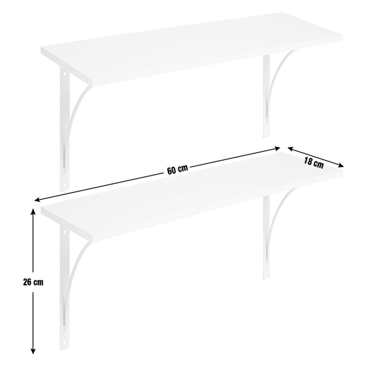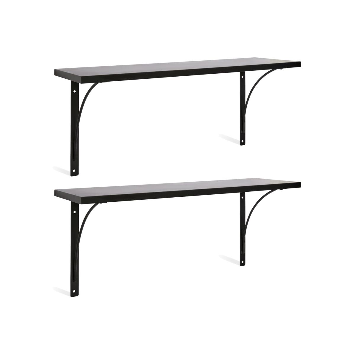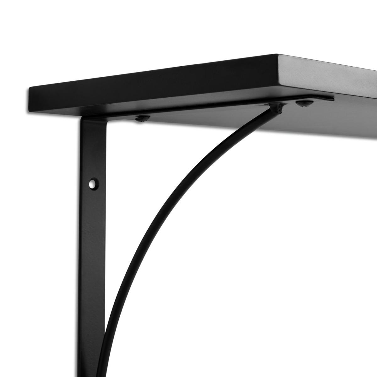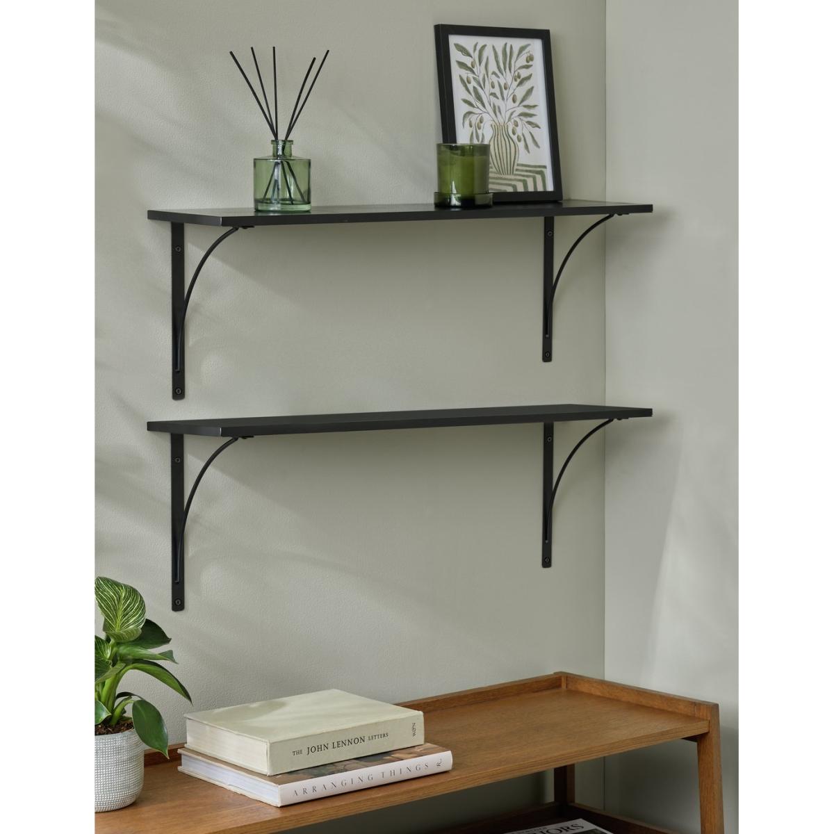 A stylish pair of display shelves with integral brackets and with a sleek, black painted finish. Come with all fixings making them easy to wall mount. Made from MDF and steel with a painted finish. Size H26, W60, D18cm. Weight 5kg. Supports a maximum weight of 8kg. Fixings included. Packed flat. FSC certified meaning the materials used for this product are responsibly sourced.