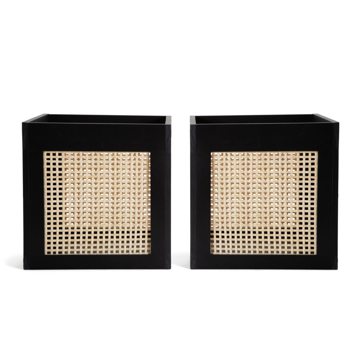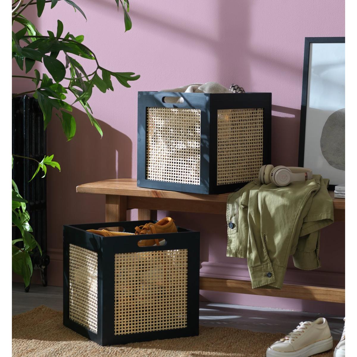 Tidy in style with our set of 2 square storage boxes. Woven rattan panels keep things natural, while a striking black frame brings a contemporary touch. Tuck toys, games or magazines inside to keep the lounge clutter-free. Shoes, scarves and gloves? Pop this pretty pair in or on top of the wardrobe. And with two smooth cut-out handles, they're a dream to move around. Box clever.