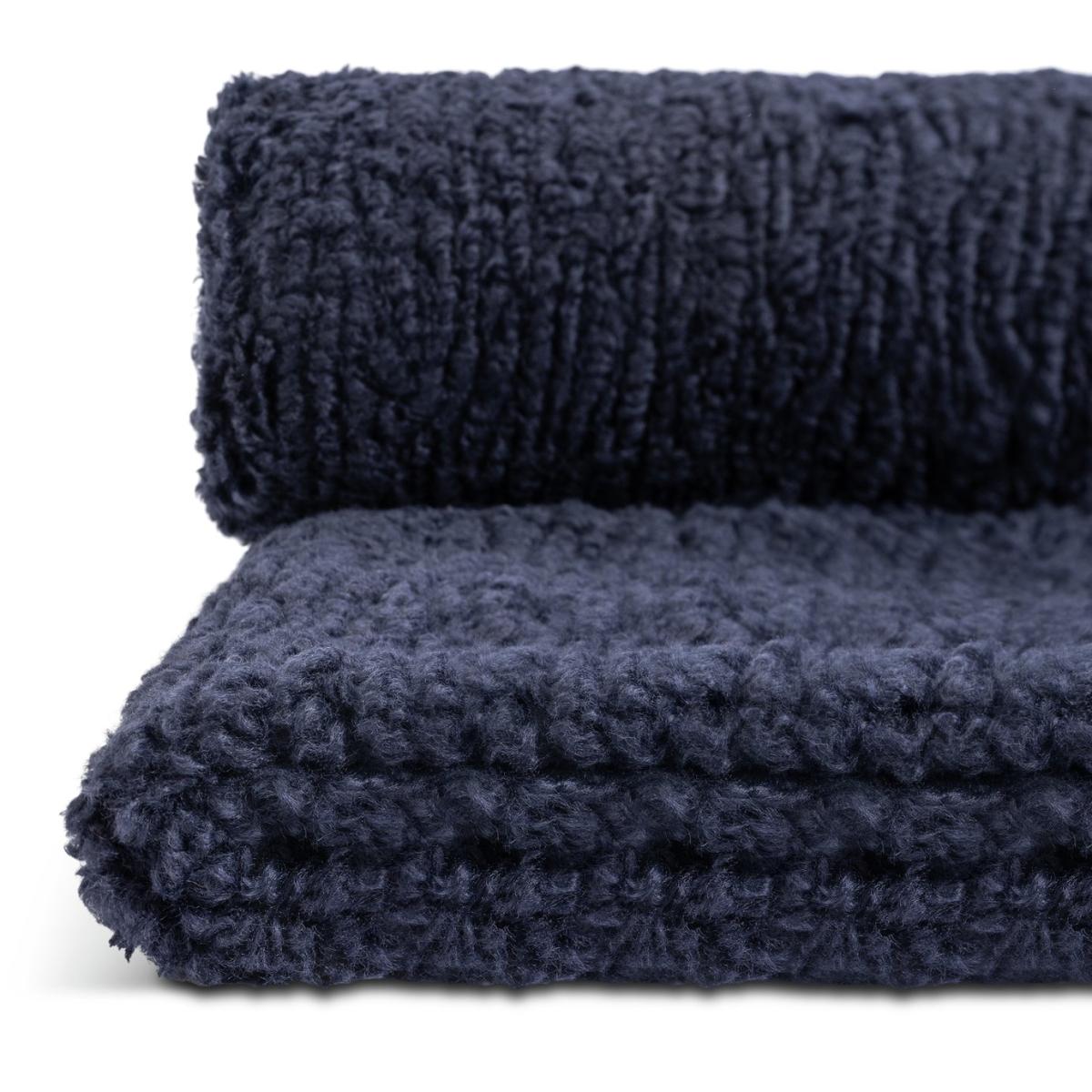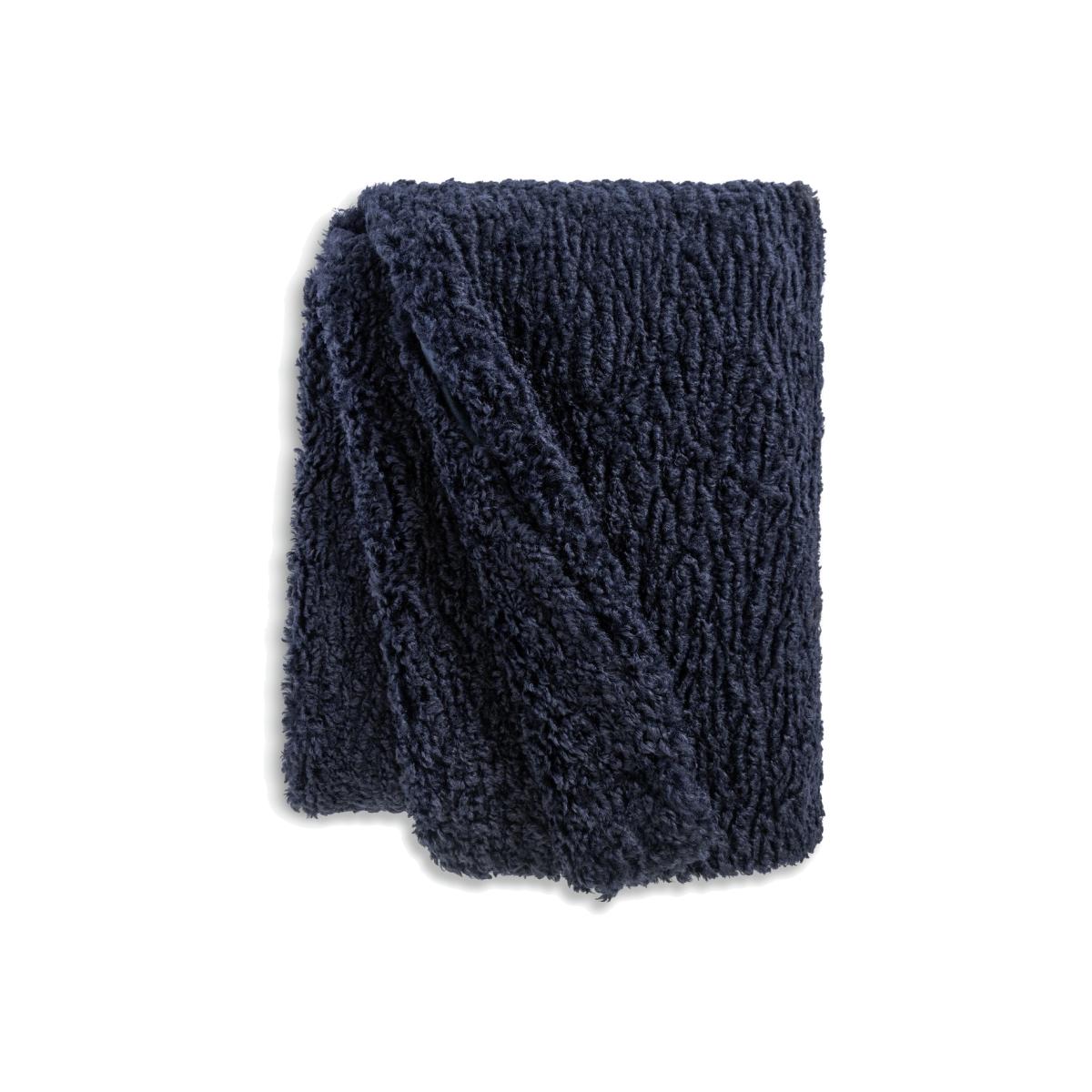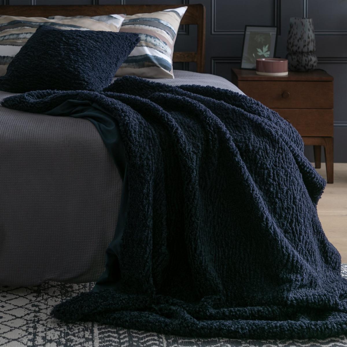 Genuinely as soft as real shearling but 100% faux. This luxurious navy throw has inviting and sumptuous looks. Warm and light, it is a dream to wrap up in on chilly evenings and perfect for a boxset binge. Or add it to your bed for an artisanal layered look. Add faux fleece cushions for a further uplift to this much-loved theme. 100% polyester. Size L125, W150cm. Machine washable.