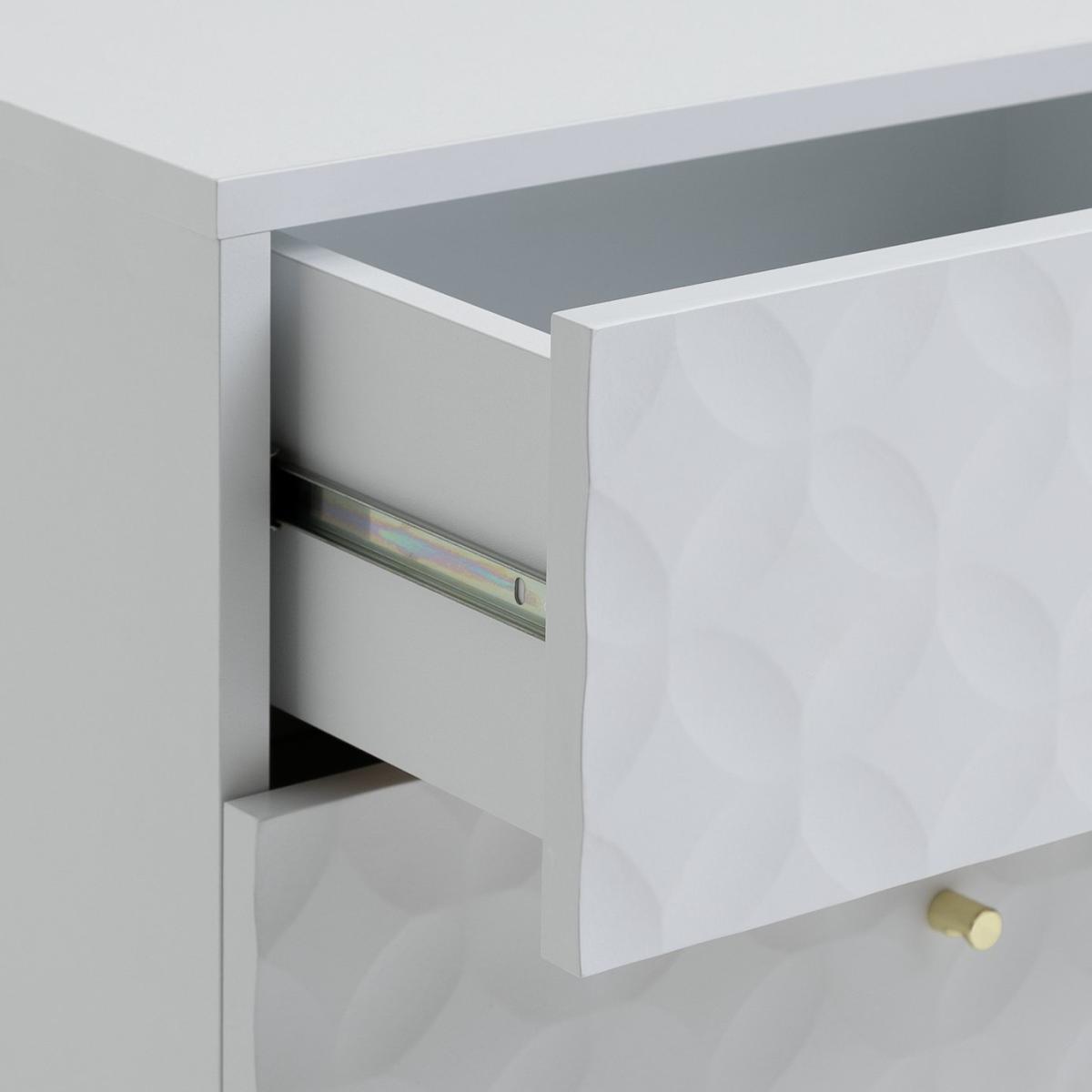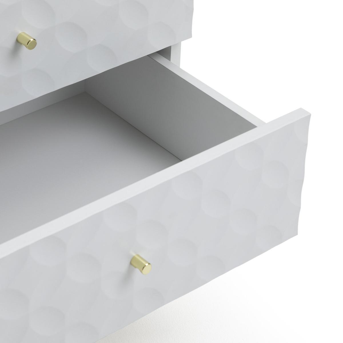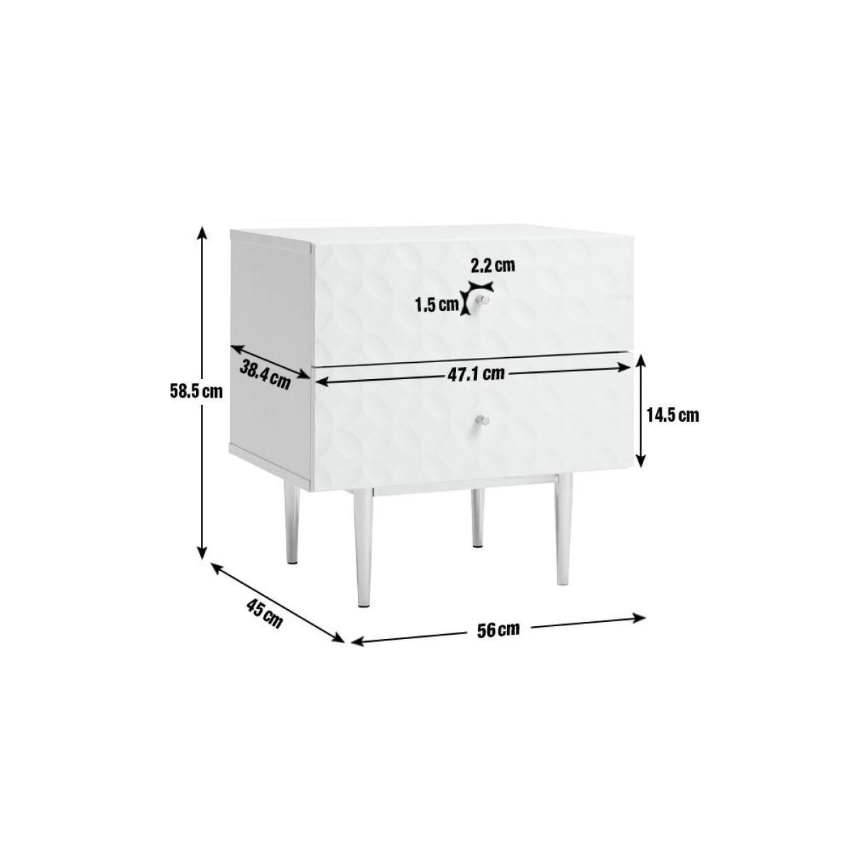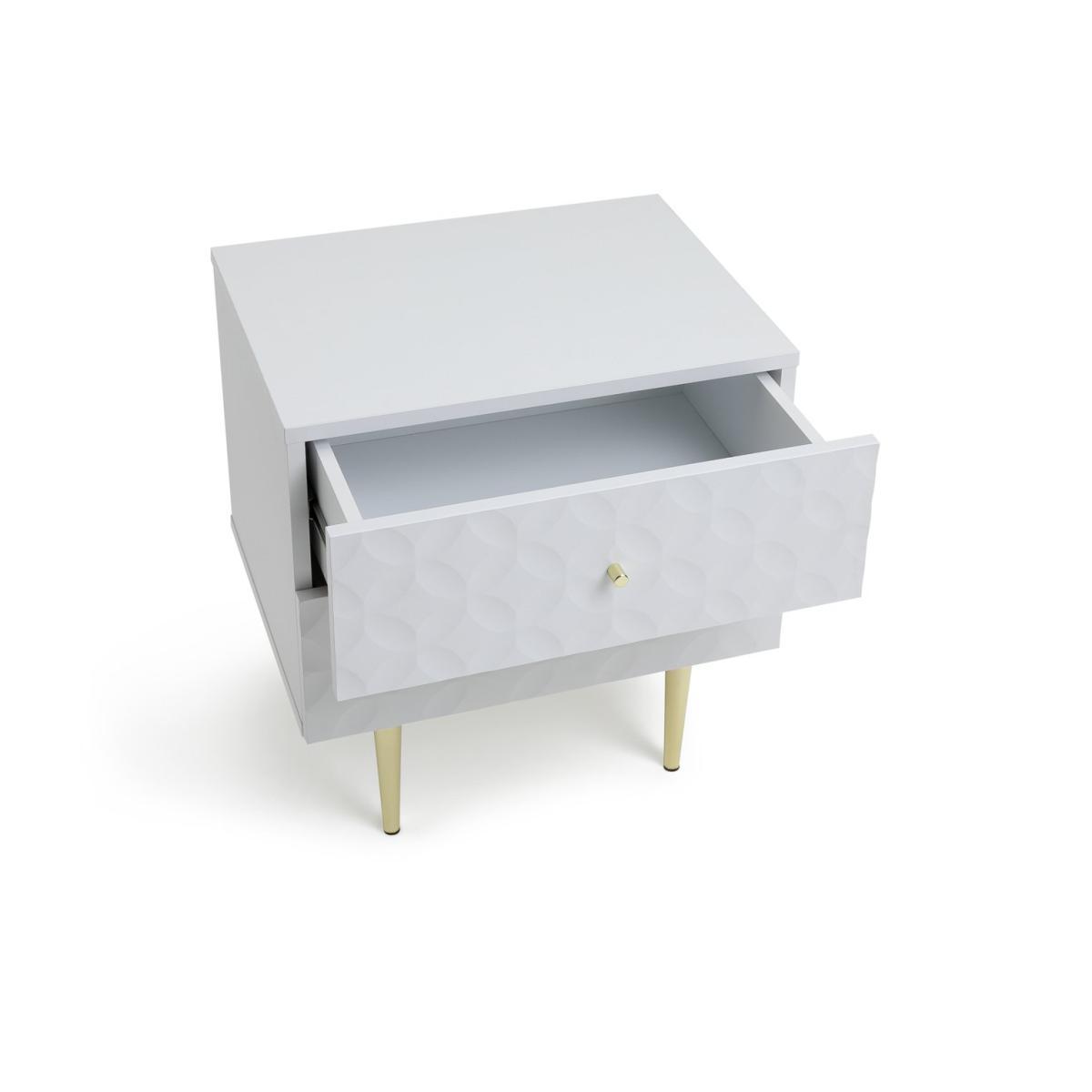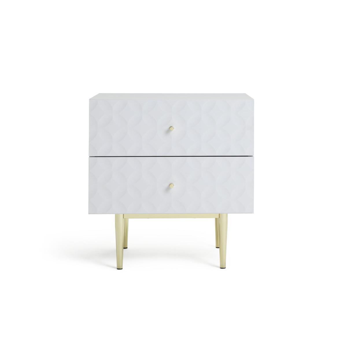 I love this bedside table because of its clean, contemporary design combined with subtle texture on the drawer fronts, which adds visual interest without overwhelming a space. The white finish makes it highly versatile, working well in both modern and Scandi-inspired interiors, as well as in eclectic settings where it can serve as a neutral backdrop. When styling, consider pairing it with soft bedding and bed linens in natural fibres or muted tones for a relaxed look, or use colourful accessories like lamps, vases, or artwork to add personality. The two drawers offer practical storage for bedside essentials, keeping surfaces clutter-free, while the angled legs bring a hint of retro charm. Overall, it’s a great choice for anyone looking for a stylish yet functional addition to their bedroom.