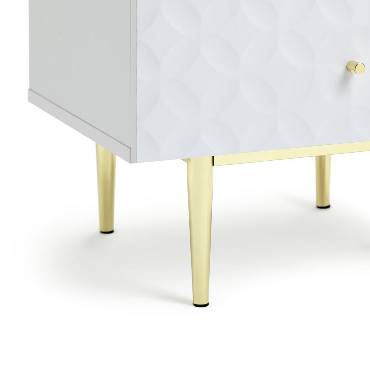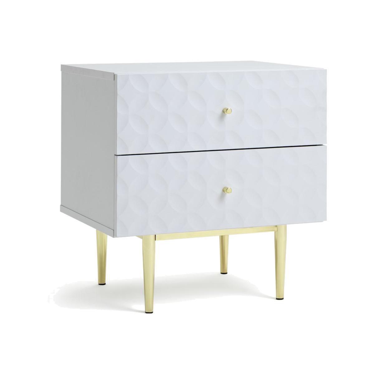 Say hello to Sienna. This charming bedside table's fresh white finish, tapered gold legs, metal handles and textured front panels really steal the show. With 2 roomy drawers on smooth metal runners, there's plenty of room for things you want close at hand. Crafted from a combination of environmentally friendly FSC certified timber and MDF, this sturdy little sidekick is anything but boring. Part of the Sienna bedroom collection, matching furniture items are available. Why not double up with a set?