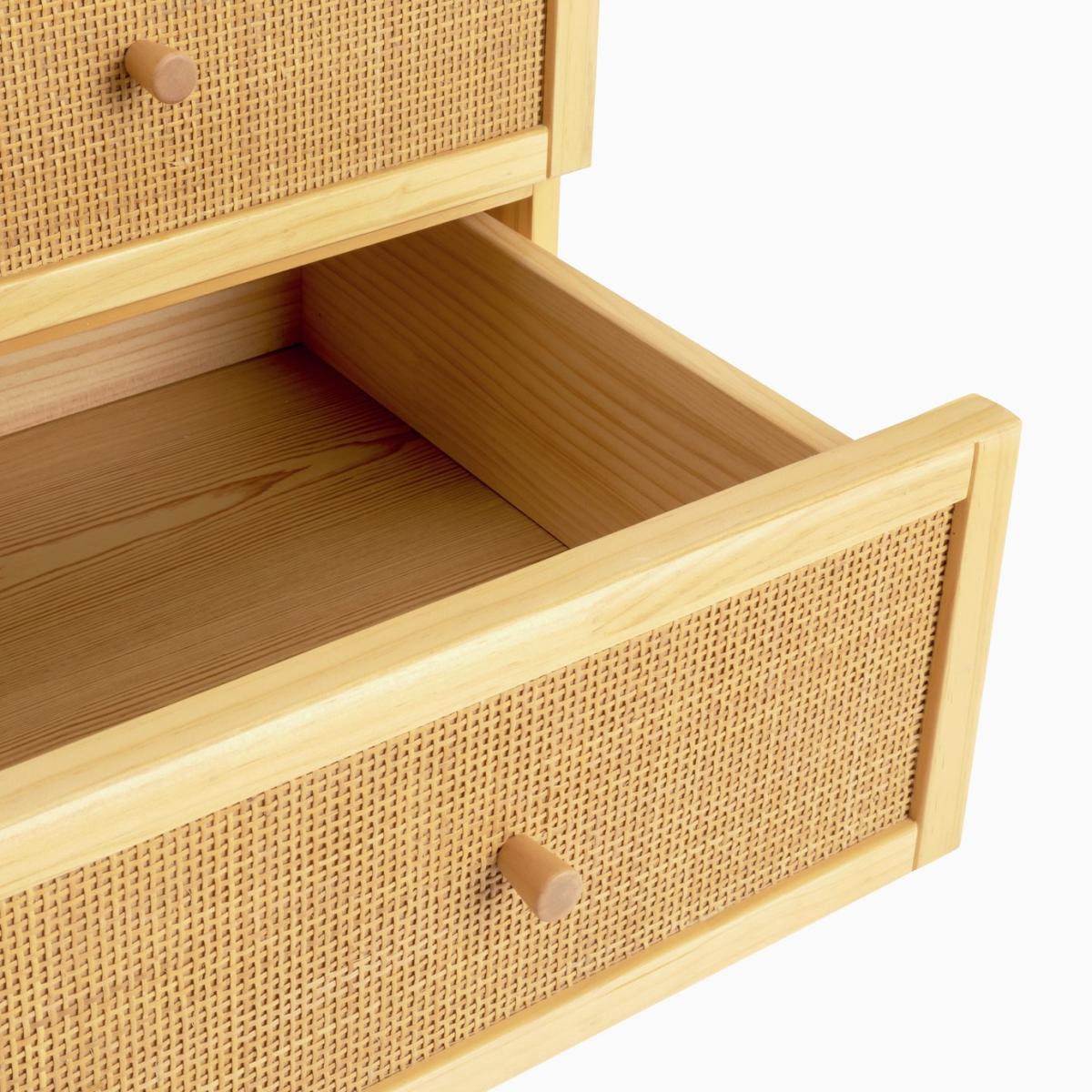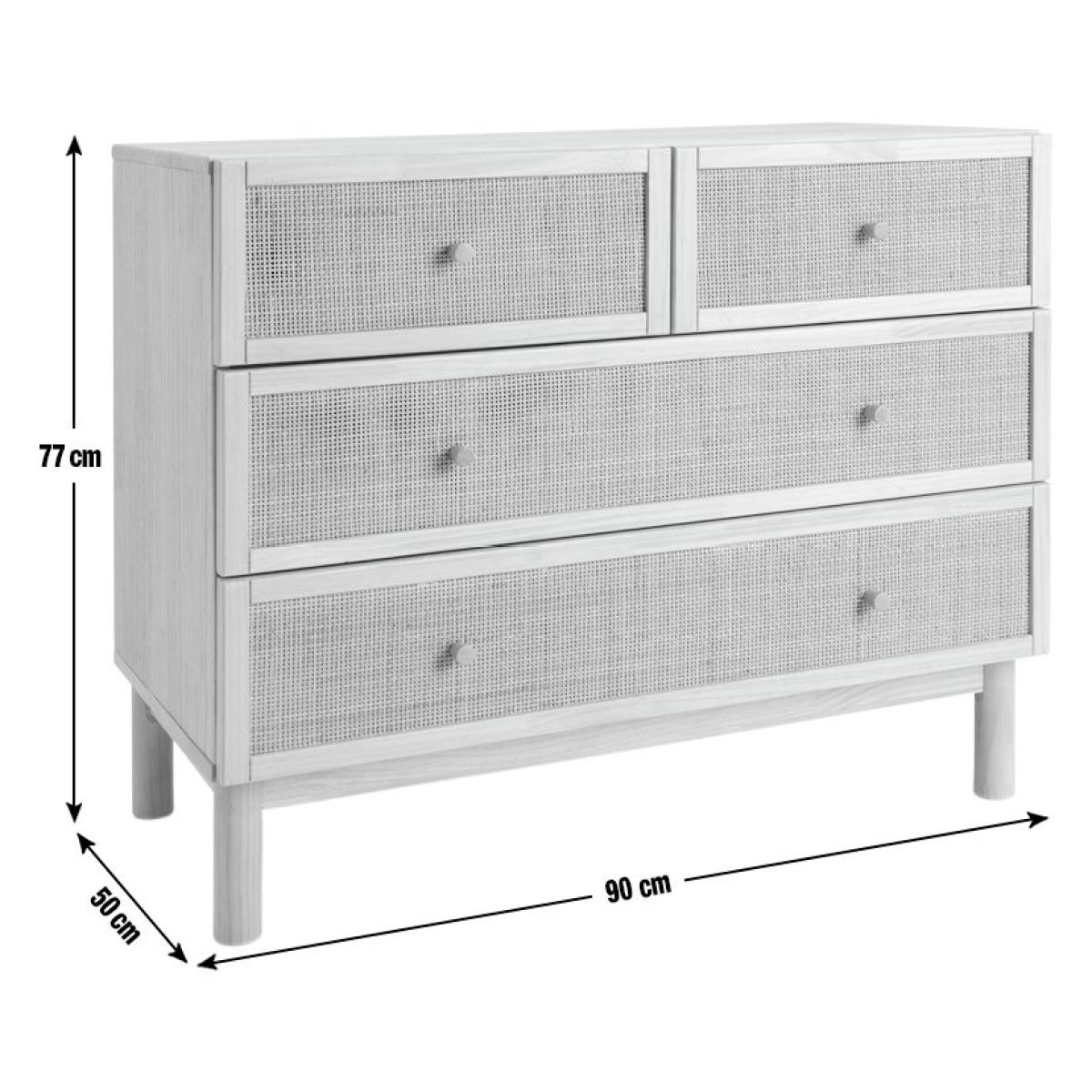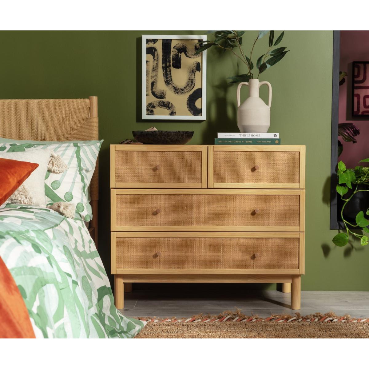 Meet Simone. She's got a great sense of style that screams boho chic. Just look at the pine frame and rattan paneling, and the round handles and legs that bring it all together. Generous too. Inside this chest of drawers there's heaps of room. The 2 top drawers are handy for accessories and cosmetics. The 2 wider bottom drawers are just right for foldables. Fancy your own make-up station? There's plenty of space on top to add a mirror. Gorgeous, right? Love the organic look? We've lots more pieces in rattan to complete the theme. Part of the Simone collection. Made of MDF and pine. Wooden handles. Additional handles not included. 4 drawers with wooden runners. Self-assembly - 2 people recommended (includes wall fixings). If this product is over 60cm high it must be securely attached to the wall to prevent overturning. Dimensions: Size H77, W90, D50cm. Internal drawer H14, W47, D38cm. Large internal drawer H14, W101, D40cm. Handle size: L2.5, W3cm. Weight 44kg. Package Dimensions: Package 1 dimensions: H15.5, W120.6, D50,. Package 1 weight: 29kg. Package 2 dimensions: H10.6, W65.3, D50.8cm. Package 2 weight: 24kg. General information: We are excited to be welcoming some of our favourite HOME products into the Habitat range. Your product may arrive in Habitat or HOME packaging. Manufacturer's 1 year guarantee.