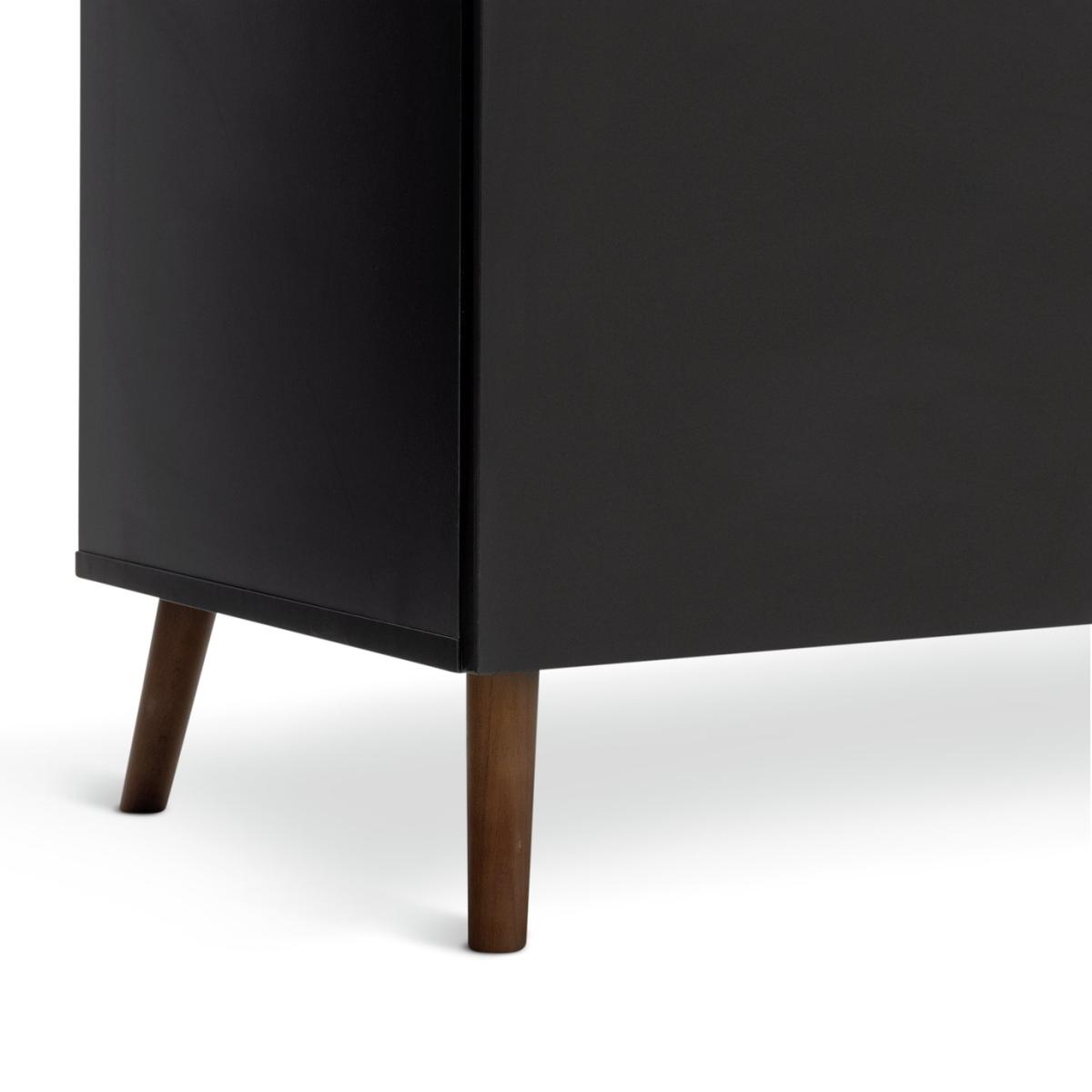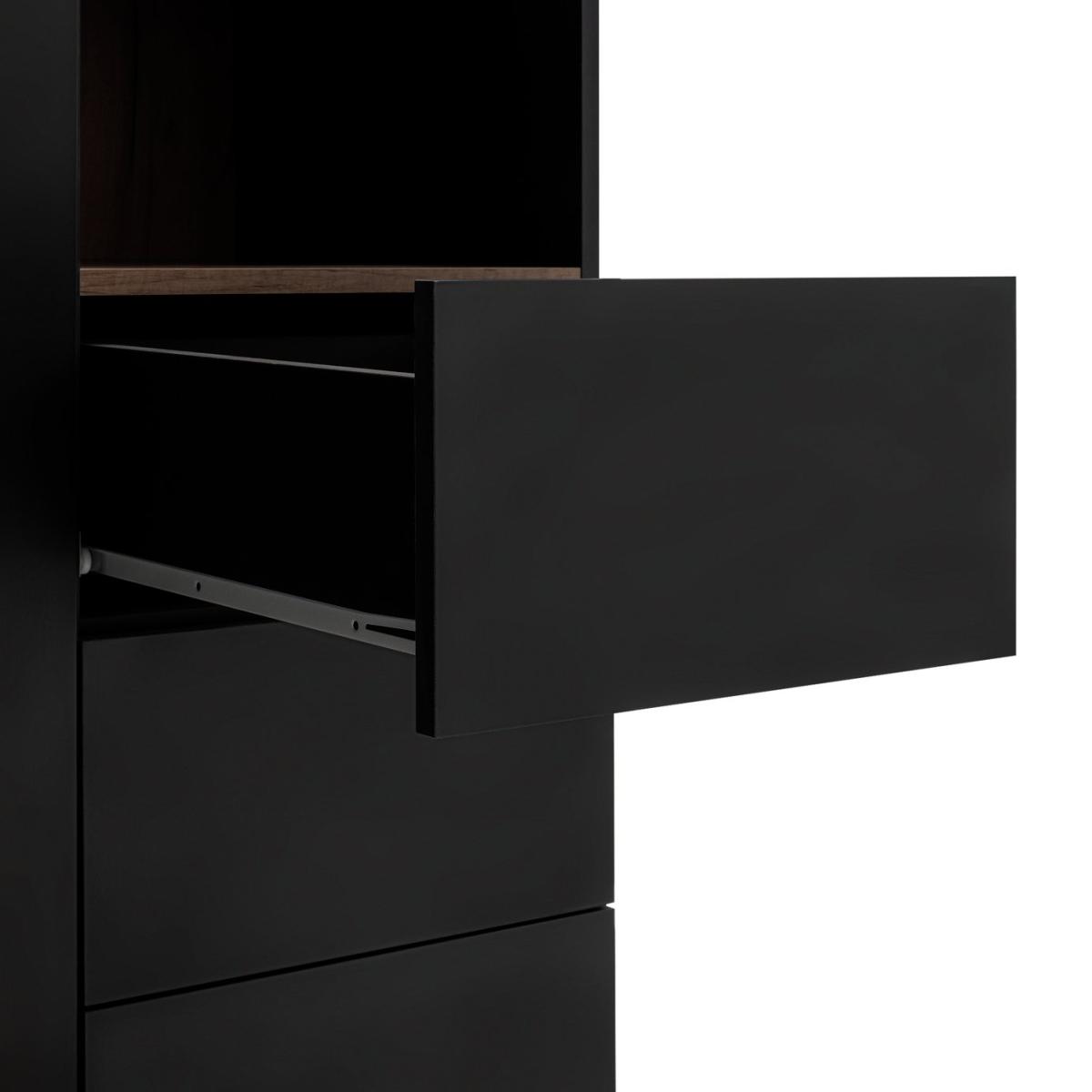 Meet Skandi -a new concept in bedroom storage where minimalism meets display. Our two-tone wardrobe delivers double hanging, sliding drawers and open shelves - space enough for any capsule collection. Its palette of black and light wood aim to create a calm bedroom sanctuary. R&R is the order of the day. A versatile piece, there are three drawers for folded garments, a hanging rail for dresses and open shelving for books and beauty bits and bobs. Its stunning white two-tone detailing really makes this range stand out from the rest. It is stood on splayed legs to make it oh-so-Nordic and the drawers are soft-close for a smooth, quiet glide. Part of the Skandi collection. Made of particleboard and solid wood. 1 door. 3 drawers with metal runners. 1 fixed hanging rail. 1 adjustable hanging rail. Hanging rail holds up to 10kg. 2 fixed shelves. Self-assembly - 2 people recommended. If this product is over 60cm high it must be securely attached to the wall to prevent overturning. Dimensions: Size H180, W90, D55.3cm. Internal hanging space H84, W40, D51cm. Internal drawer H17, W37, D41cm. Weight 84kg. Package Dimensions: Package 1 dimensions: H13.8, W56.2, D103.1cm. Package 1 weight: 32.18kg. Package 2 dimensions: H6.6, W56.1, D174.5cm. Package 2 weight: 29.78kg. Package 3 dimensions: H5.4, W54.1, D177.7cm. Package 3 weight: 24.26kg. General information: FSC certified meaning the materials used for this product are responsibly sourced.