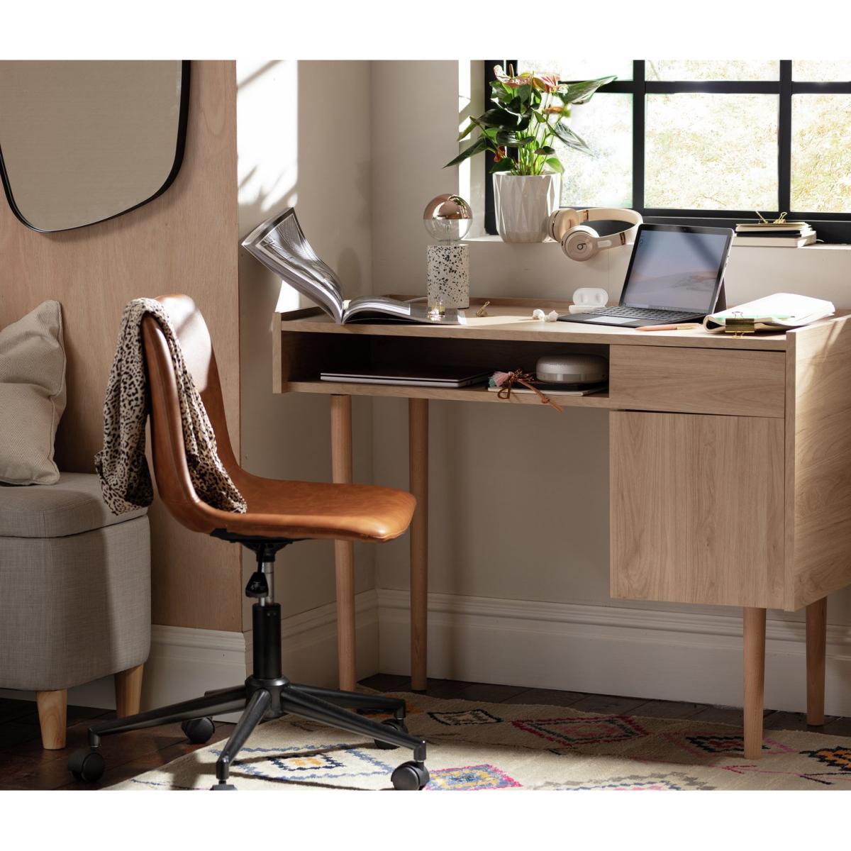 I love this desk for its clean, minimalist design and warm oak effect that can seamlessly fit into various interior styles-from Scandi-inspired schemes to contemporary or even pared-back industrial spaces. Its compact size makes it a practical choice for smaller rooms or home offices, and the single drawer offers handy storage without cluttering the surface. To style it effectively, consider pairing with light-coloured or textured accessories, such as woven baskets or soft lighting, to enhance its natural wood tone. For a more personalised look, add a small desk lamp, a couple of plants, or even a statement chair to create a functional yet inviting workspace.