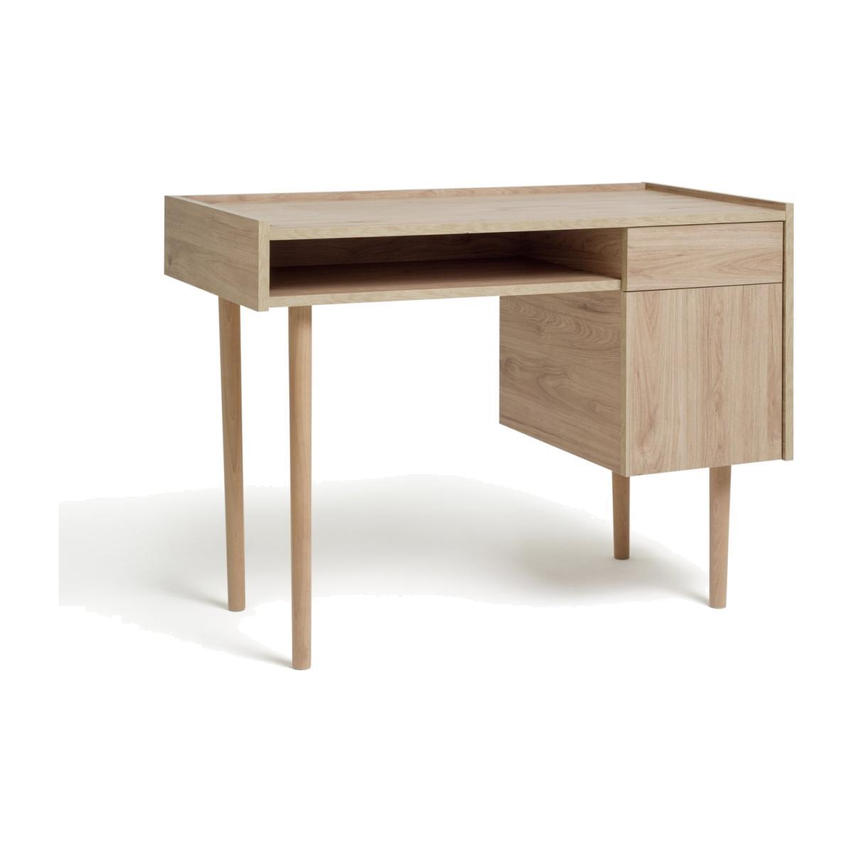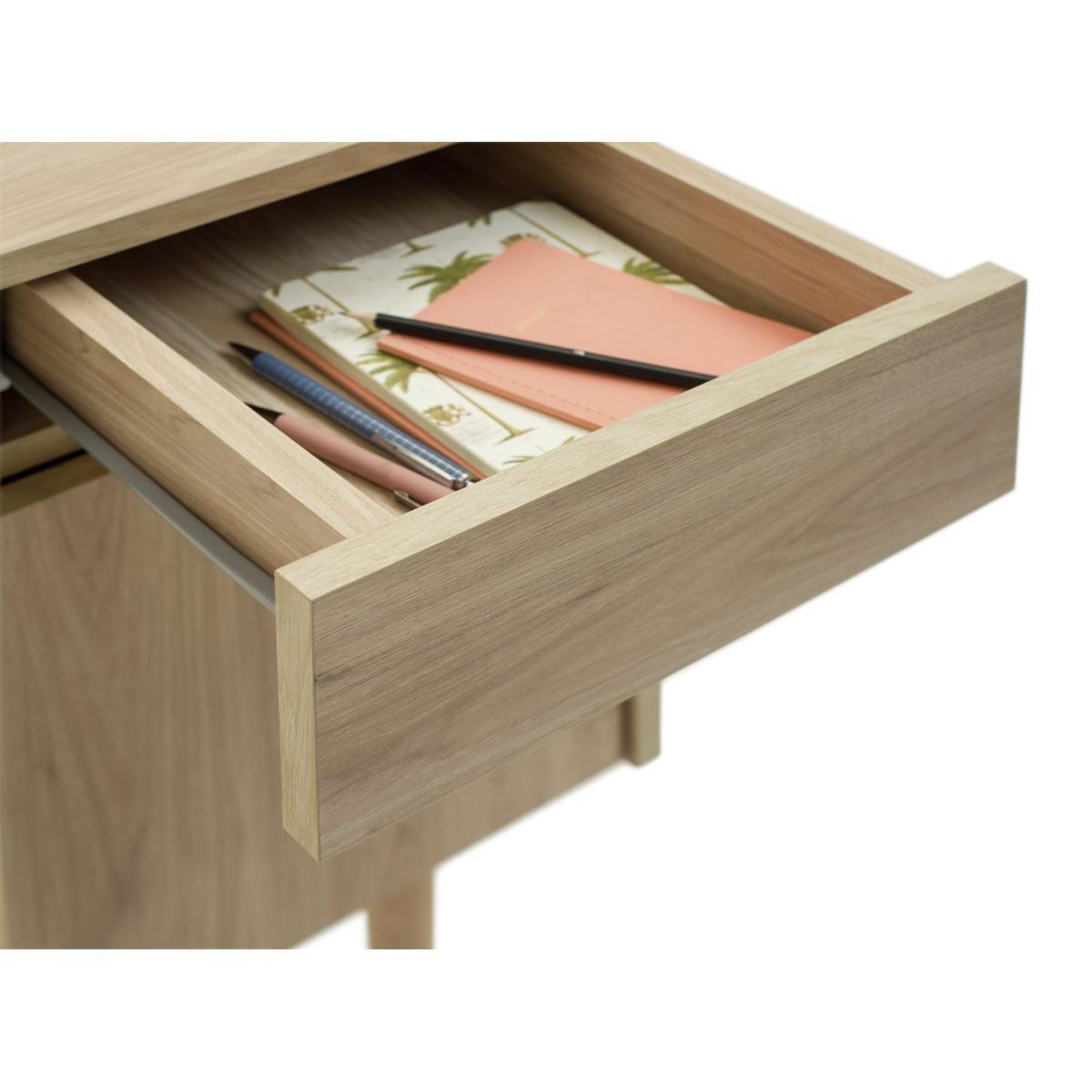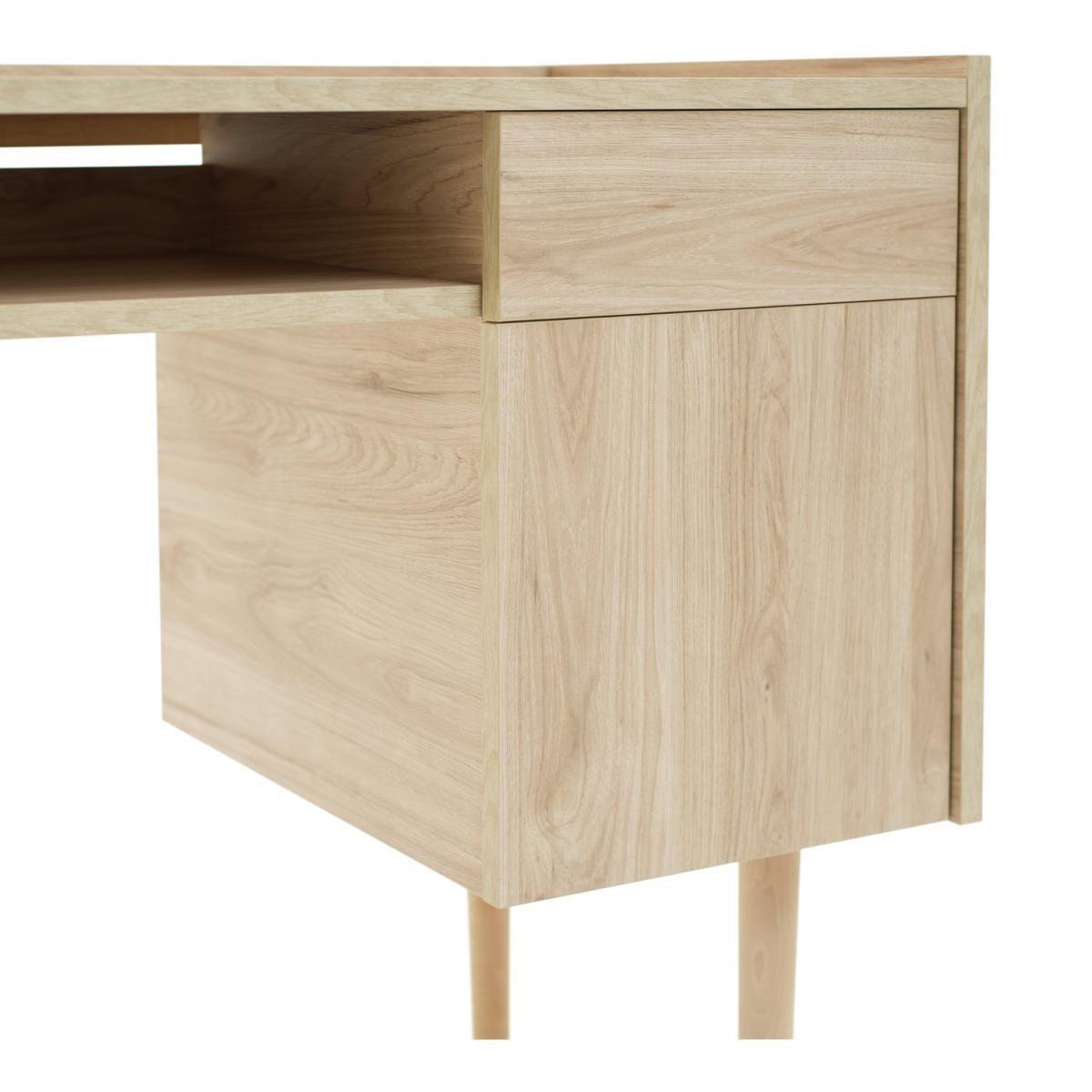 Simple, minimalist style - that's the Skandi desk. In natural oak-effect wood, with clean lines and tapered legs, this timeless desk is a work from home essential. Crafted with ample storage, you can keep all your documents and files organised with the built-in drawer and cupboard. There's even a fixed shelf for storing books, stationary or your keyboard when it's not in use. A natural beauty, take your office space to the next level with the Skandi desk.