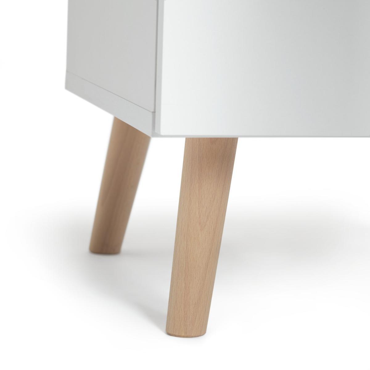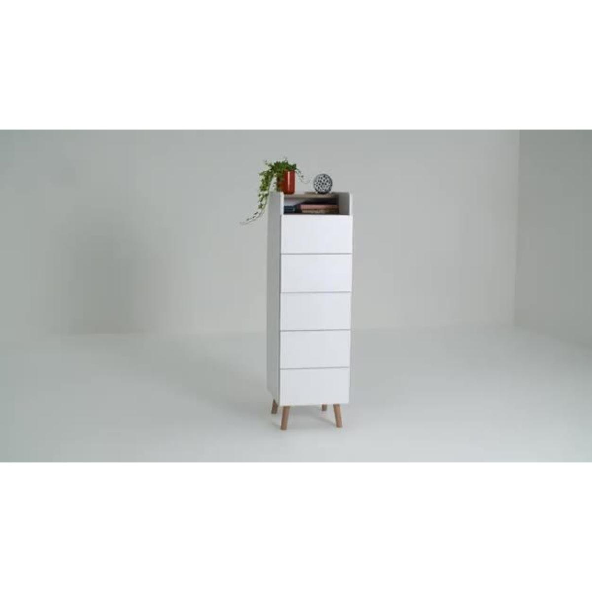 Tall and slim. Very Scandinavian. Say hello to our tallboy chest where minimalist drawer fronts meet slim shelving and splayed legs in natural warm wood. With 5 easy slide drawers, there is plenty of room for folding tops, socks and accessories. Style the distinctive two-tier surface and give your room an instant lift. Personalise with fresh flowers, funky vase or favourite photo frame. There are endless possibilities.
