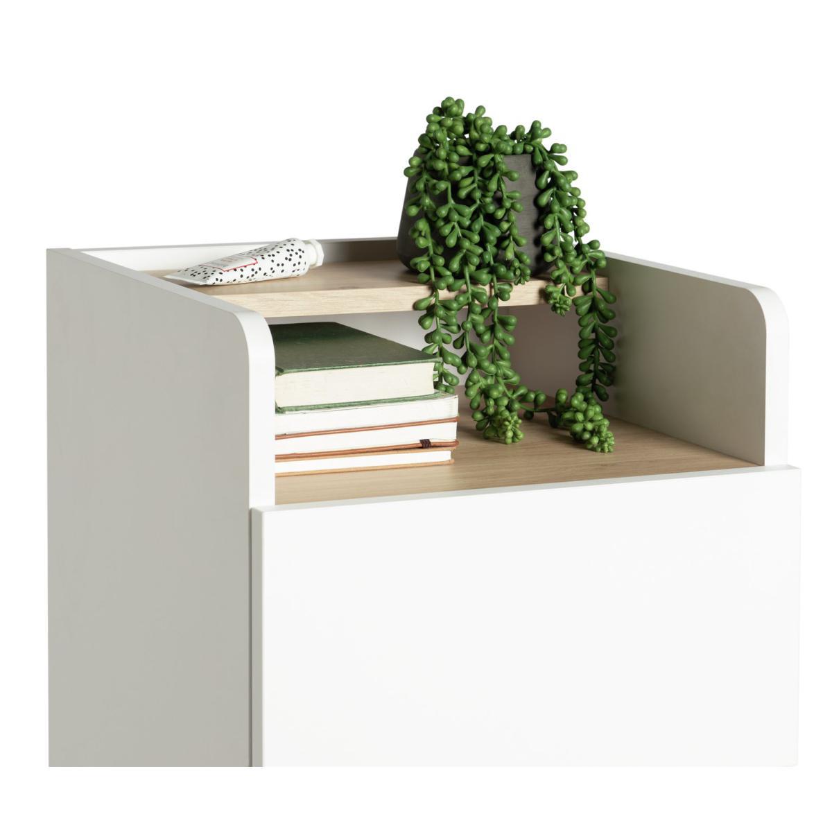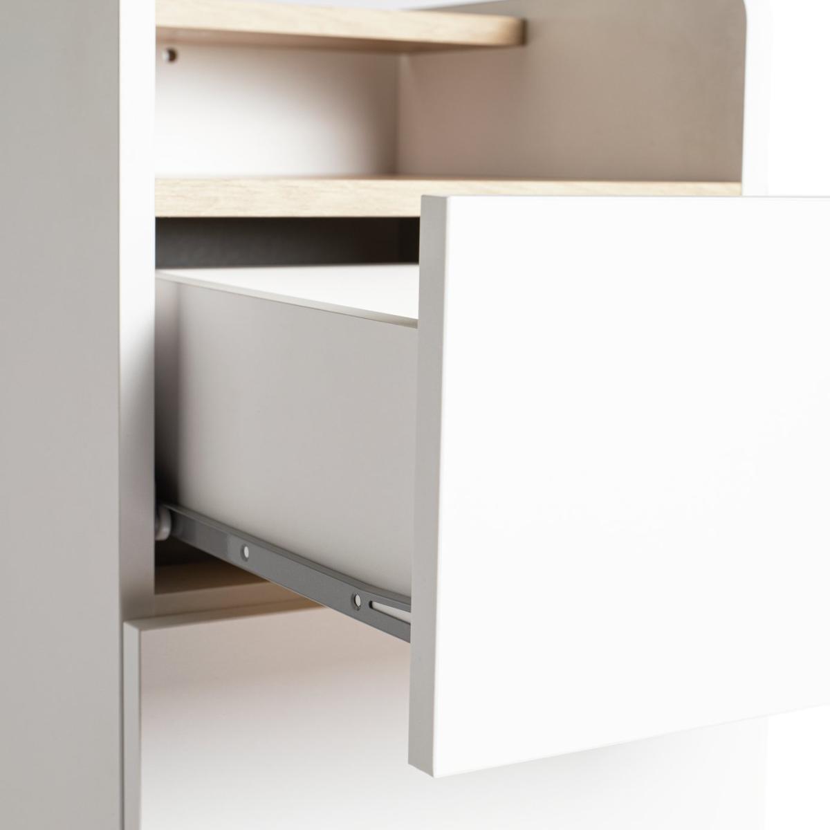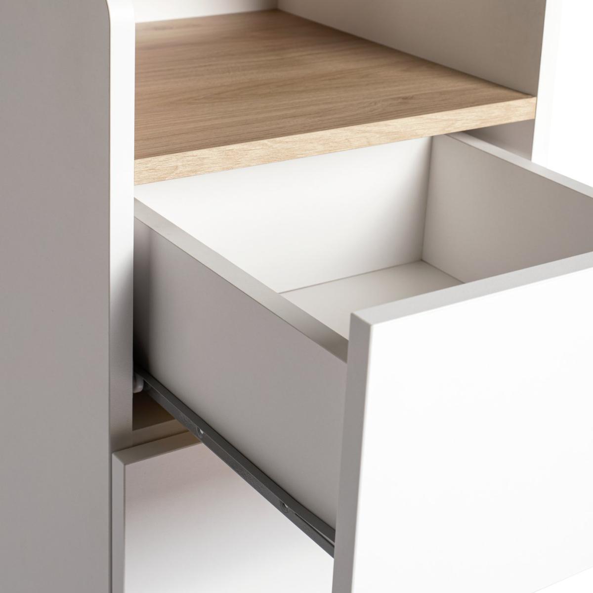 I love this tallboy because of its clean, Scandi-inspired design that effortlessly combines function with style. The white and natural wood two-tone finish makes it highly versatile, working well in minimalist, modern, or even slightly eclectic interiors. It’s perfect for adding extra storage without overwhelming a space, and its slim profile helps it fit neatly into bedrooms, hallways, or living rooms. For styling tips, consider pairing it with understated decorative objects, like sleek lamps or woven baskets on top, to keep the look light and contemporary. Also, utilise the drawers for organisation-think specialised organisers or colour-coding to keep your belongings tidy and accessible. Overall, it’s a practical, good-looking piece that complements a neutral palette while adding a touch of Scandinavian simplicity.