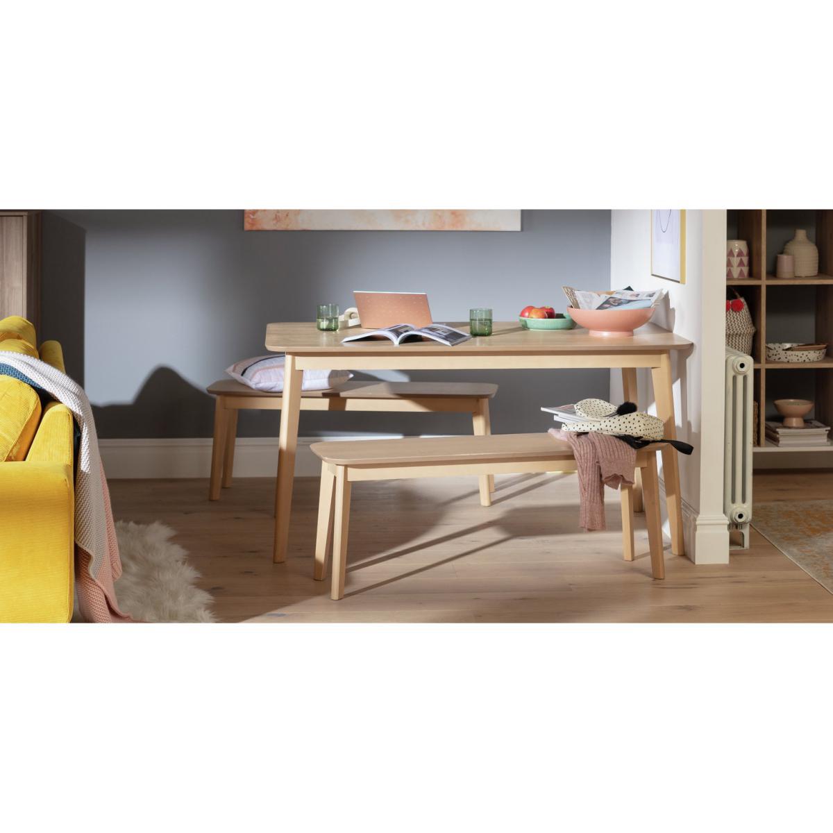 Do you have an appetite for Scandinavian design? The calming light oak-effect Habitat Skandi dining table will freshen up your dining space. With a clean modern look and tapered legs, this table is sleek, simple and stylish all rolled into one. Forget dining out when you have this beauty to enjoy meals at! Stay in and enjoy family meals or dinner parties in the comfort of your own home. Part of the Skandi collection. Table: Table size: H75, L150, W85cm. Wood effect table with solid wood legs. Wood veneer table top finish. Self-assembly - 2 people recommended. Weight of table 24kg. Package Dimensions: Table packaging size: H13, W92, D156cm. General information:We are excited to be welcoming some of our favourite HOME products into the Habitat range. Your product may arrive in Habitat or HOME packaging. Manufacturer's 1 year guarantee.