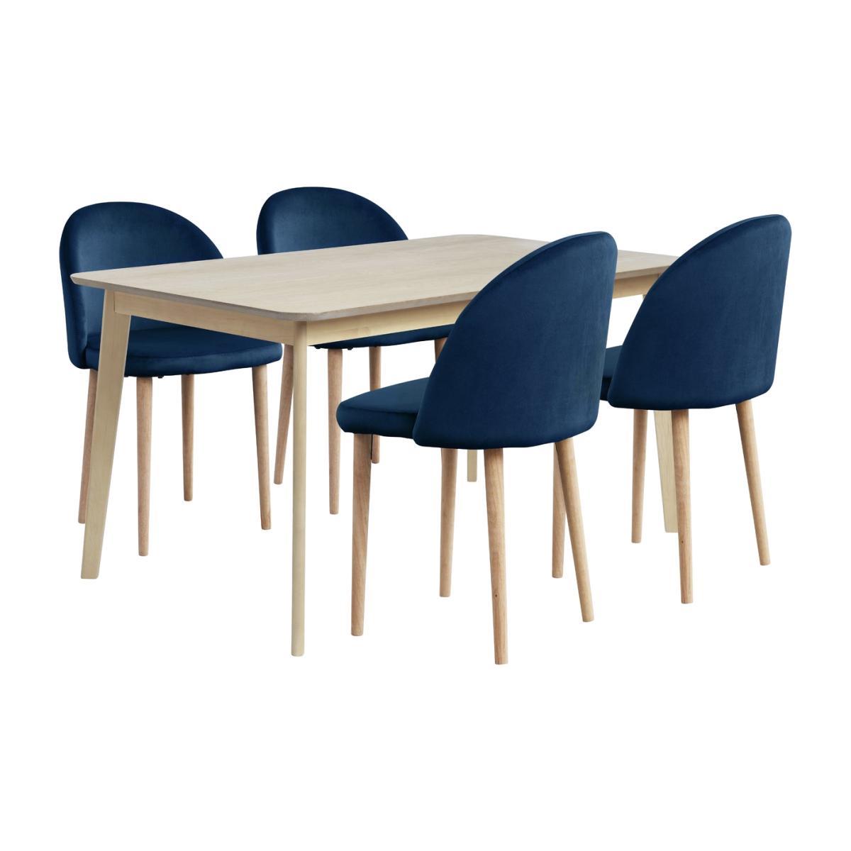 Fine dining, Skandi style. Our solid wood dining set serves up elegant Nordic simplicity. The pale wood brings a fresh laid back feel to the table. Sink back into the 4 padded navy tub chairs, they're designed for comfort. Smart enough for special occasions? Certainly. Relaxed enough for everyday? Absolutely. So linger over lunch, make time for dessert. Enjoy the simple pleasures in life.