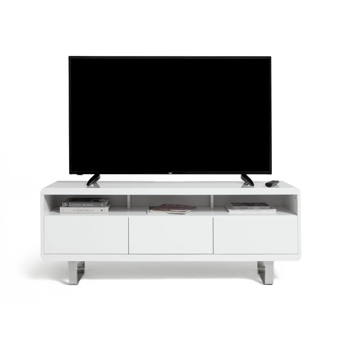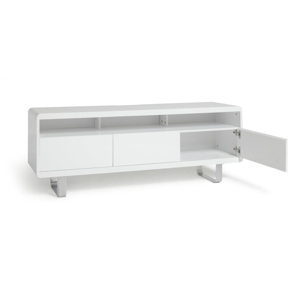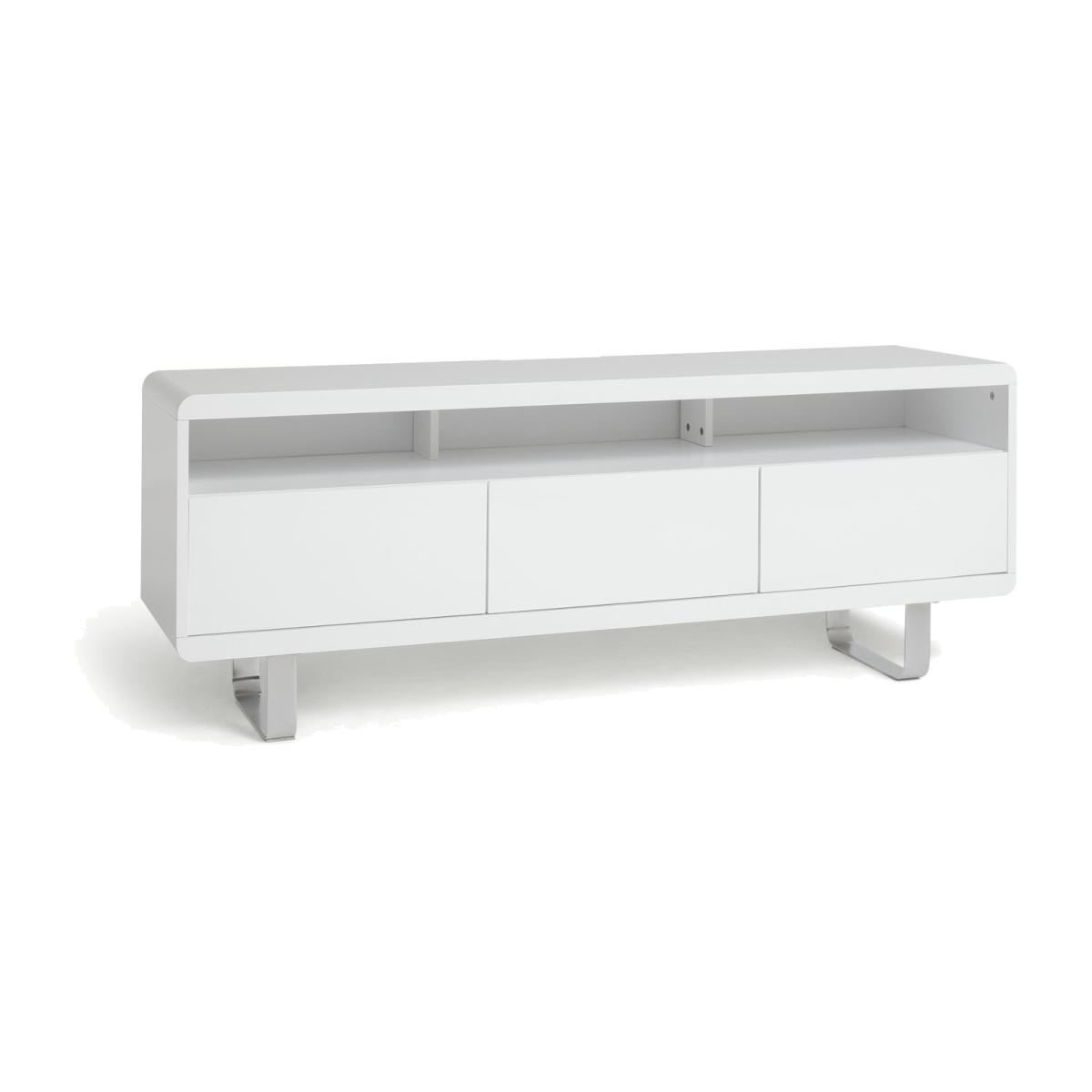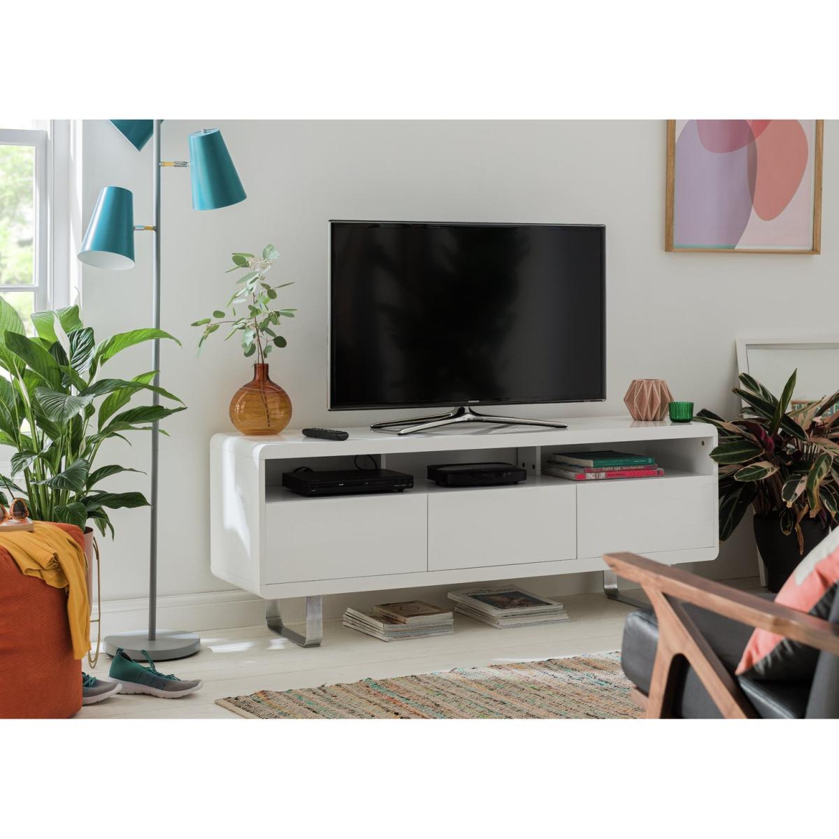 A contemporary cool collection. Habitat Sleigh has a high-gloss grey finish, for a lounge that looks smart and fresh. This effortlessly stylish TV unit is raised from the ground on stand-out, polished sleigh legs, so it is sure to modernise your home. Smoothly does it the Sleigh boasts rounded edges and, of course, the sleekness and reflective sheen of the high-gloss. The full-length open shelf will house your media devices, whilst the soft-closing doors and drawer are perfect for hiding away techy clutter. We've given the Sleigh a streamlined design, so there's no handles - you simply push to open the doors and drawer. So long as your telly isn't wider than 65 inches, you can perch it on top of this striking unit. Part of the Sleigh collection. Size H 57, W 150, D 40cm. Weight 36kg. 1 drawer with metal runners. 1 shelf. 2 doors. 1 media storage section. Largest height of media equipment sections 12cm. Easy cable access. Suitable for screen sizes up to 55in. Maximum weight of TV 50kg. Self-assembly - 2 people recommended. General information:We are excited to be welcoming some of our favourite HOME products into the Habitat range. Your product may arrive in Habitat or HOME packaging.