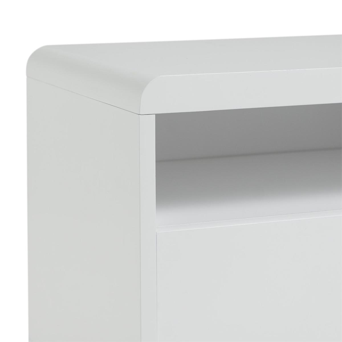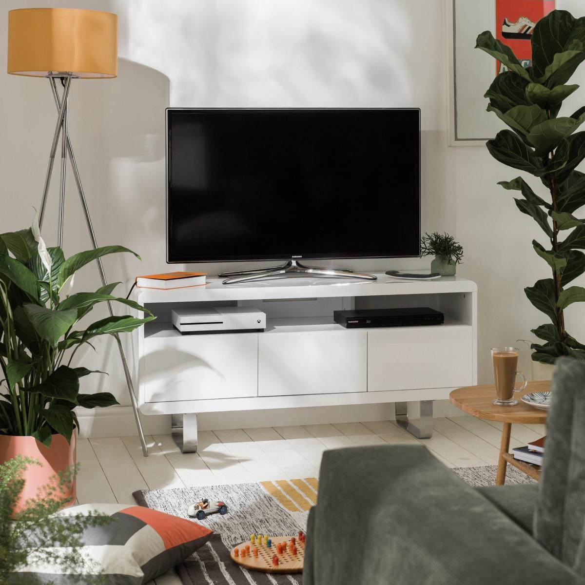 I love this white gloss TV unit for its clean, modern look that instantly brightens up any living space. It works particularly well in contemporary and minimalist interiors, but can also add a fresh touch to Scandi-style or even eclectic setups. The sleek finish reflects light beautifully, helping to make smaller rooms appear more spacious. Practical styling tips include placing decorative items like a minimalist vase or framed photos on top to personalise the space, while utilising the internal storage for media accessories or gaming consoles keeps the surface clutter-free. Pairing it with metallic accents or textured soft furnishings can elevate the overall aesthetic, making it a versatile piece for a range of interior styles.
