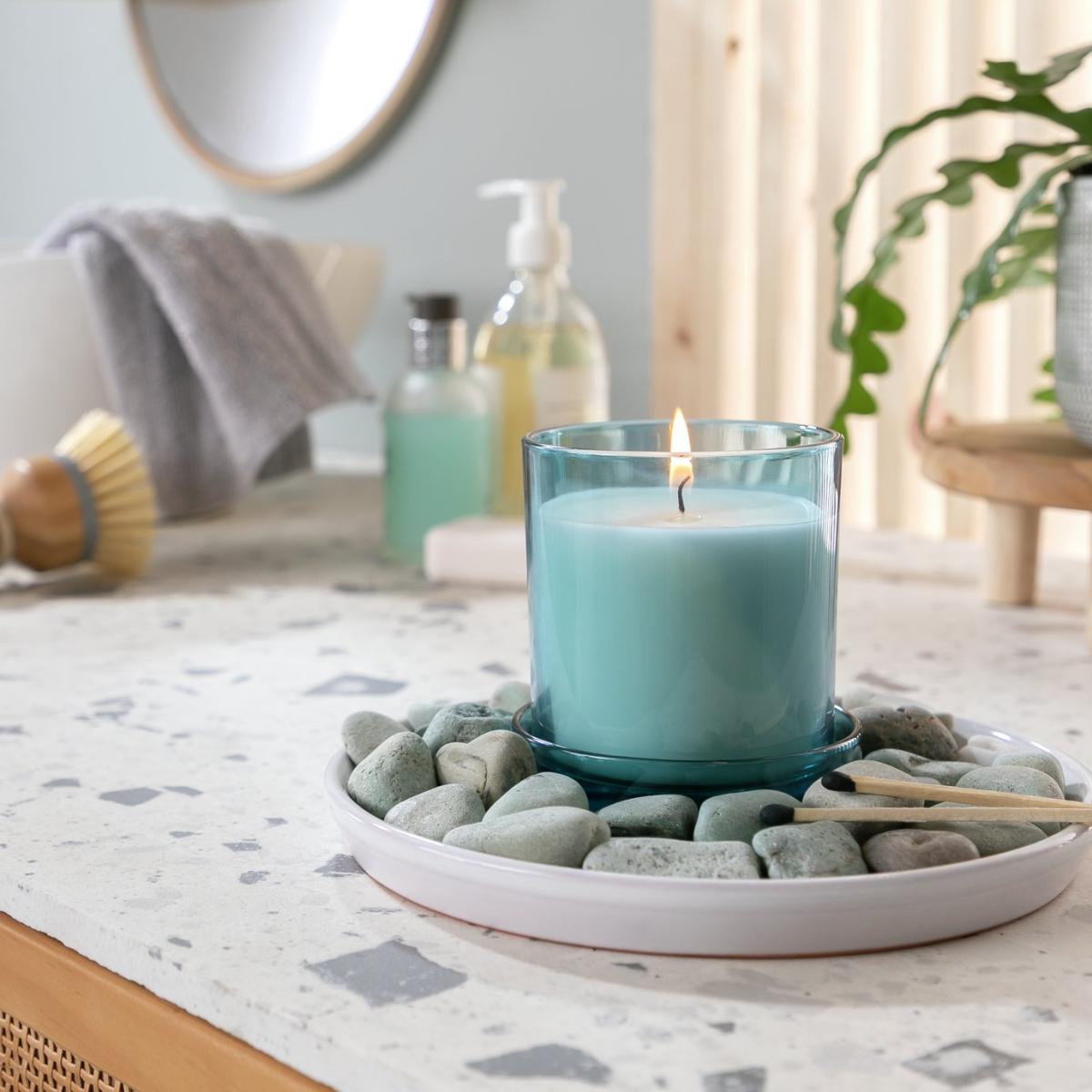 I love the small candle in the wild seasalt & driftwood scent for its versatility and calming aesthetic. The glass container with its subtle blue hue works well in both coastal-inspired and modern minimalist interiors, adding a touch of colour without overpowering the space. It’s perfect for placing on side tables, shelves, or by the bath to create a relaxed atmosphere. Practical styling tips include pairing it with other natural textures like linen or wood, and keeping the lid on when not in use to preserve the scent. It’s an easy way to introduce a gentle, fresh fragrance while enhancing a relaxed, coastal vibe in the home.