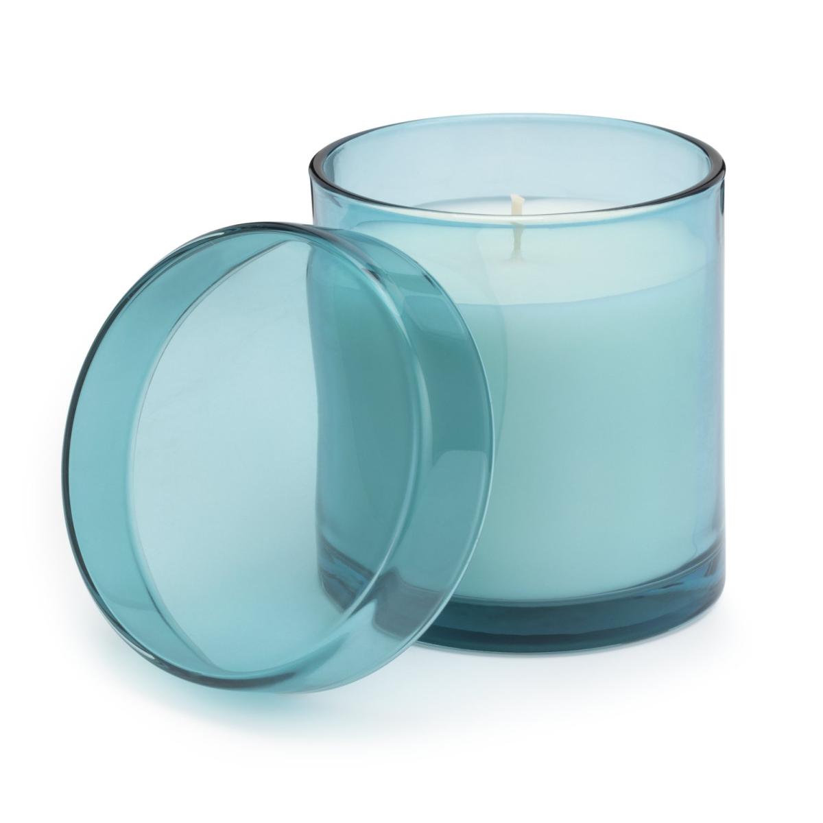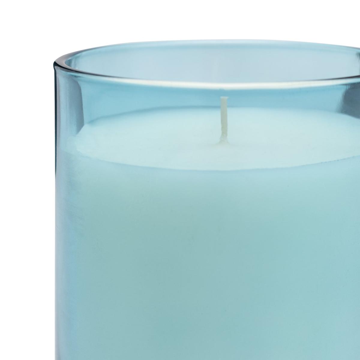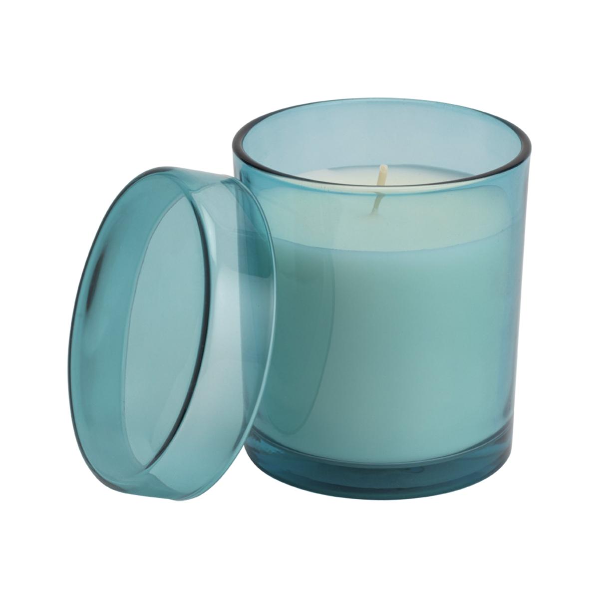 Bring home the fresh aroma of the sea with this scented candle. Features fragrant notes of sea salt blended with musky driftwood. Poured into an ocean blue frosted glass jar with a lid. Seasalt & Driftwood scent. Paraffin wax. Approximate burn time 30 hours. Size H9.2, W8.6, D8.6cm. Diameter 8.6cm.