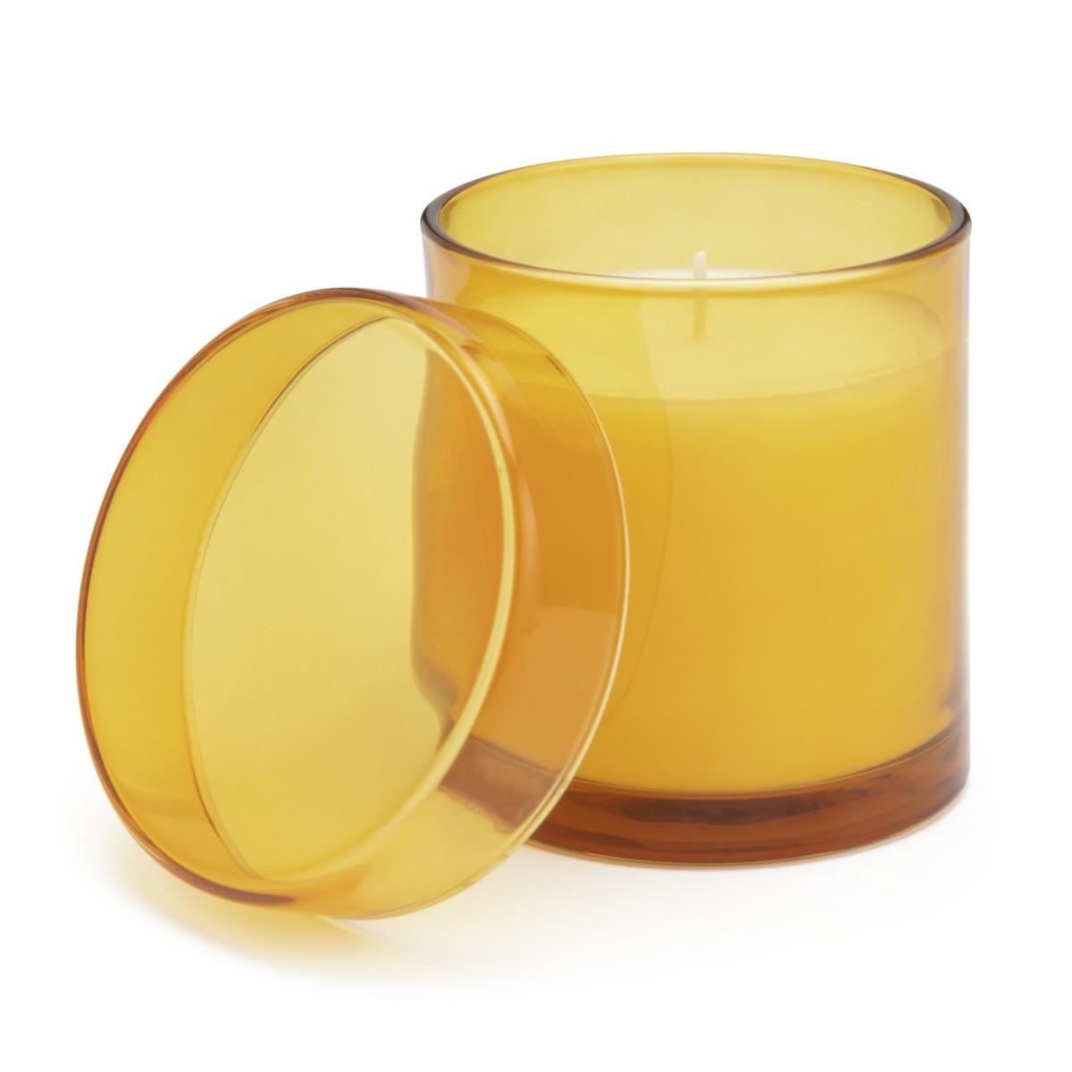 Bring home a warm ambience with this small fragrant candle. Features earthy notes of patchouli blended with rich amber. Poured in an elegant yellow frosted glass jar with a lid. Patchouli and amber scent. Paraffin wax. Approximate burn time 30 hours. Size H9.2, W8.6, D8.6cm. Diameter 8.6cm.