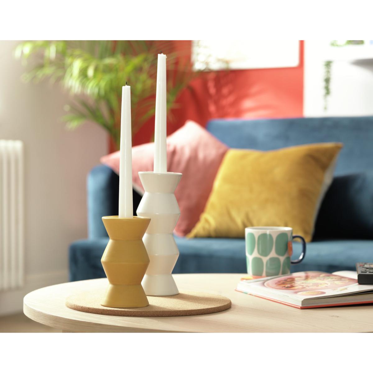 Mellow in mustard. Our shapely ceramic candle holder knows how to set the mood. The distinctive zig-zag design lights up a modern decor or blends beautifully in a home that says country. Suitable for taper or tealight candles, this versatile holder is a solid all-rounder. Adorn the mantlepiece, brighten the bedroom or dress the dining table for date night. The perfect finishing touch.