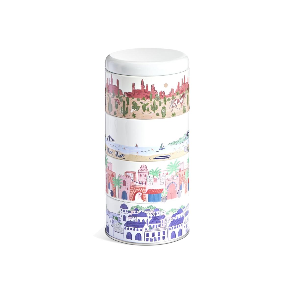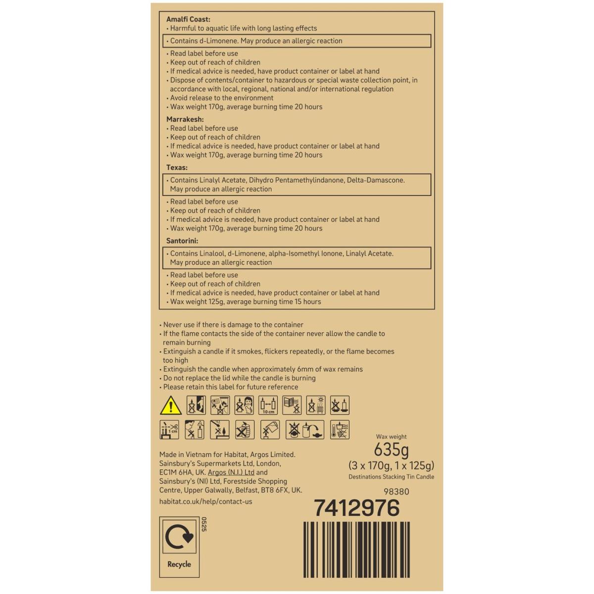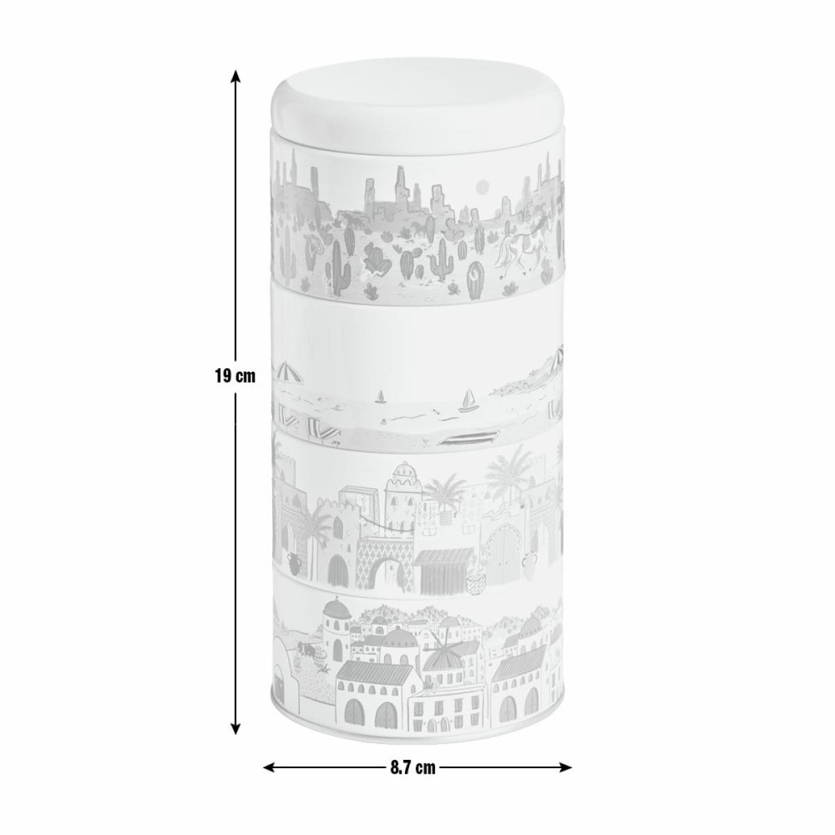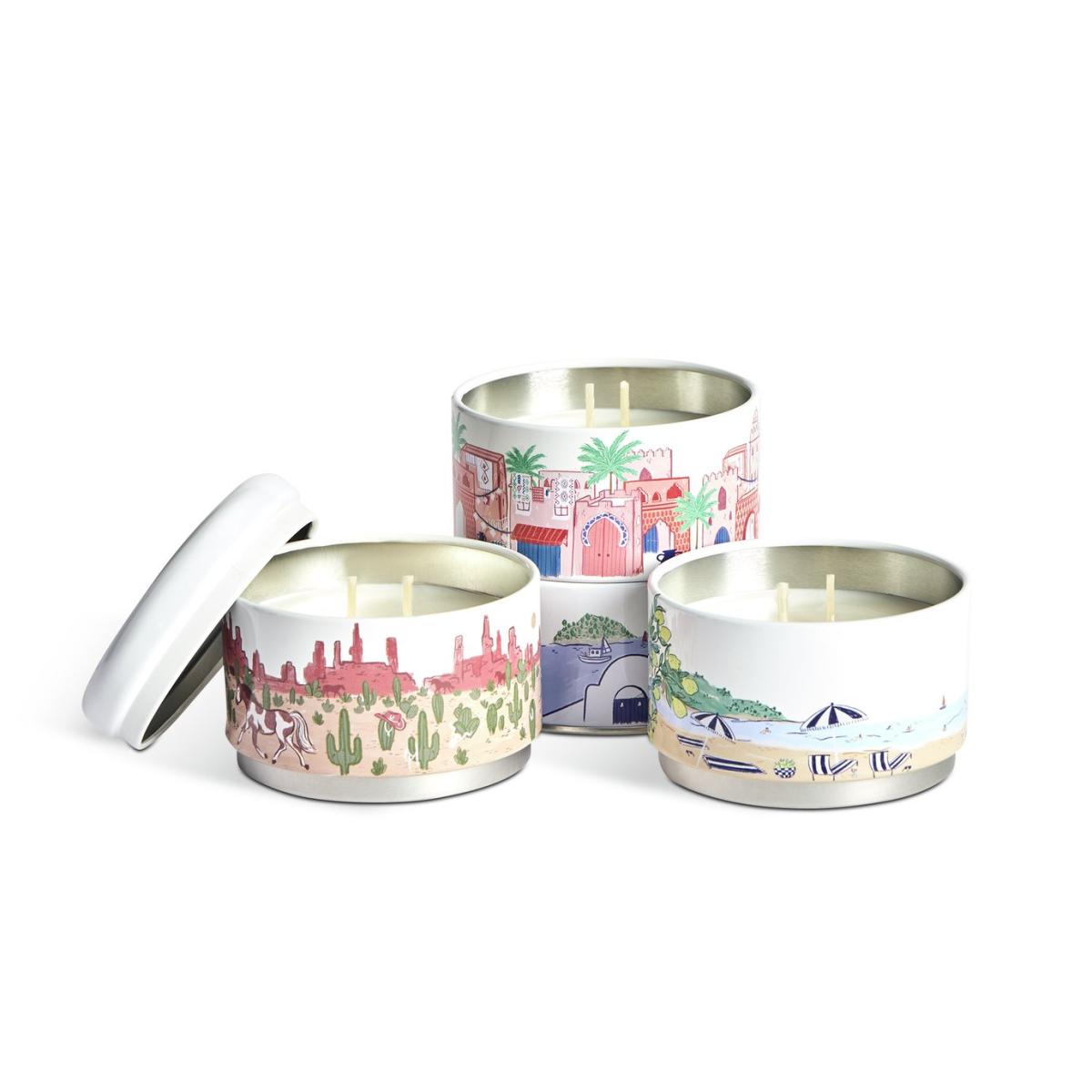 Travel the world with this set of stacking candles. Exotic scents inspired by Amalfi, Santorini, Texas and Marrakesh will add ambient magic wherever you place them. Presented in richly illustrated tins featuring iconic sights from each country. They're the perfect gift for family or friends. Amalfi, Marrakesh, Texas, Santorini scent. Size H19, W8.7, D8.7cm. Diameter 8.7cm.