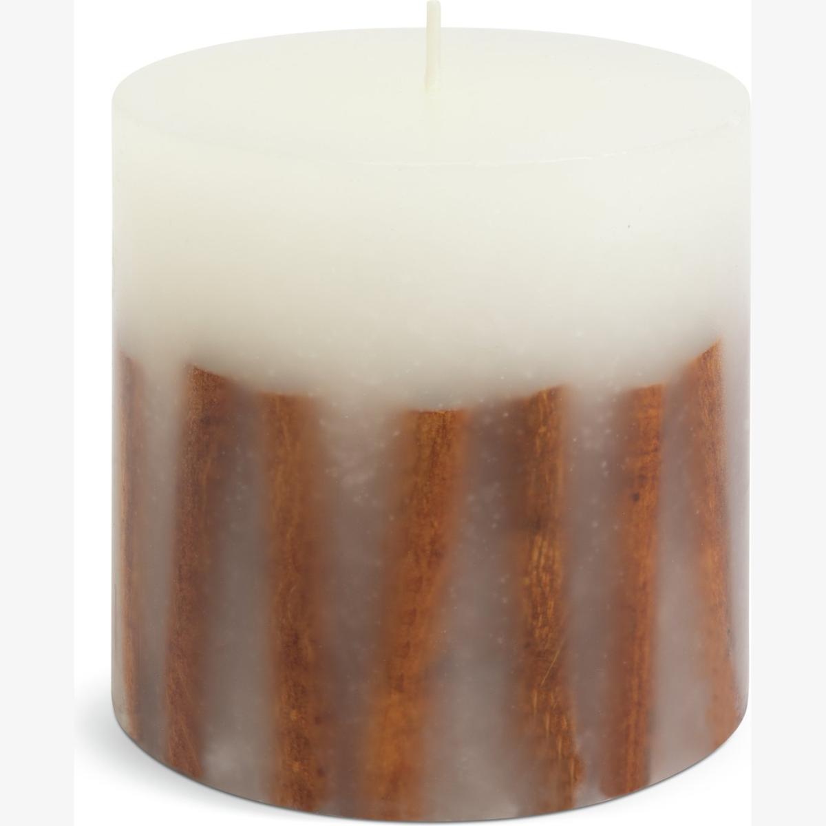 Welcome the spirit of winter with our small fir balsam inclusion candle. Notes of clove mingle with pine and maple on a cedar base. The result is a warm, rich woody blend with a hint of sweetness. It's a fragrance to celebrate. A visual treat too. Featuring organic cinnamon that wows through the pale creamy wax. Fir Balsam Cinnamon scent. Paraffin wax. Approximate burn time 70 hours. Size H10.2, W10.2, D10.2cm.