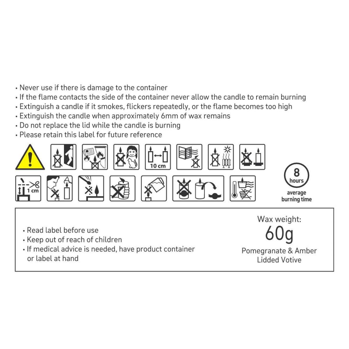 Fruity, rich and aromatic. Our pomegranate and amber votive candle is uplifting without being overpowering. A fresh, juicy burst that enlivens the room, cloaked in warm, comforting scented softness. Light the candle and set the aura to calm. Pomegranate & Amber scent. Paraffin wax. Approximate burn time 8 hours. Size H12, W14, D14cm. Diameter 14cm.