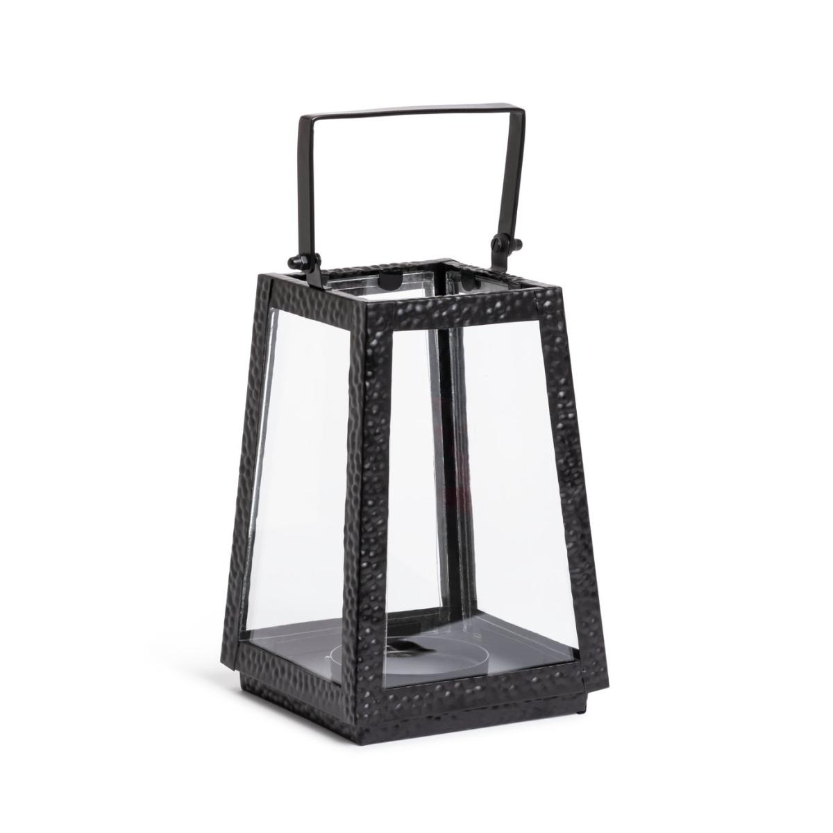 A glamorous glow. Our matte black iron and glass lantern has a contemporary tapered shape and dotted textured finish. Dining alfresco or snuggled up on the sofa? Place a candle inside this handsome holder and create a cosy feel. The sturdy handle makes it easy to carry or hook up. Pop it on the floor, on a table or suspend from a tree. Traditionally romantic. Instantly atmospheric. Setting the mood? Bring on the ambience with lamps and candles in our collection.