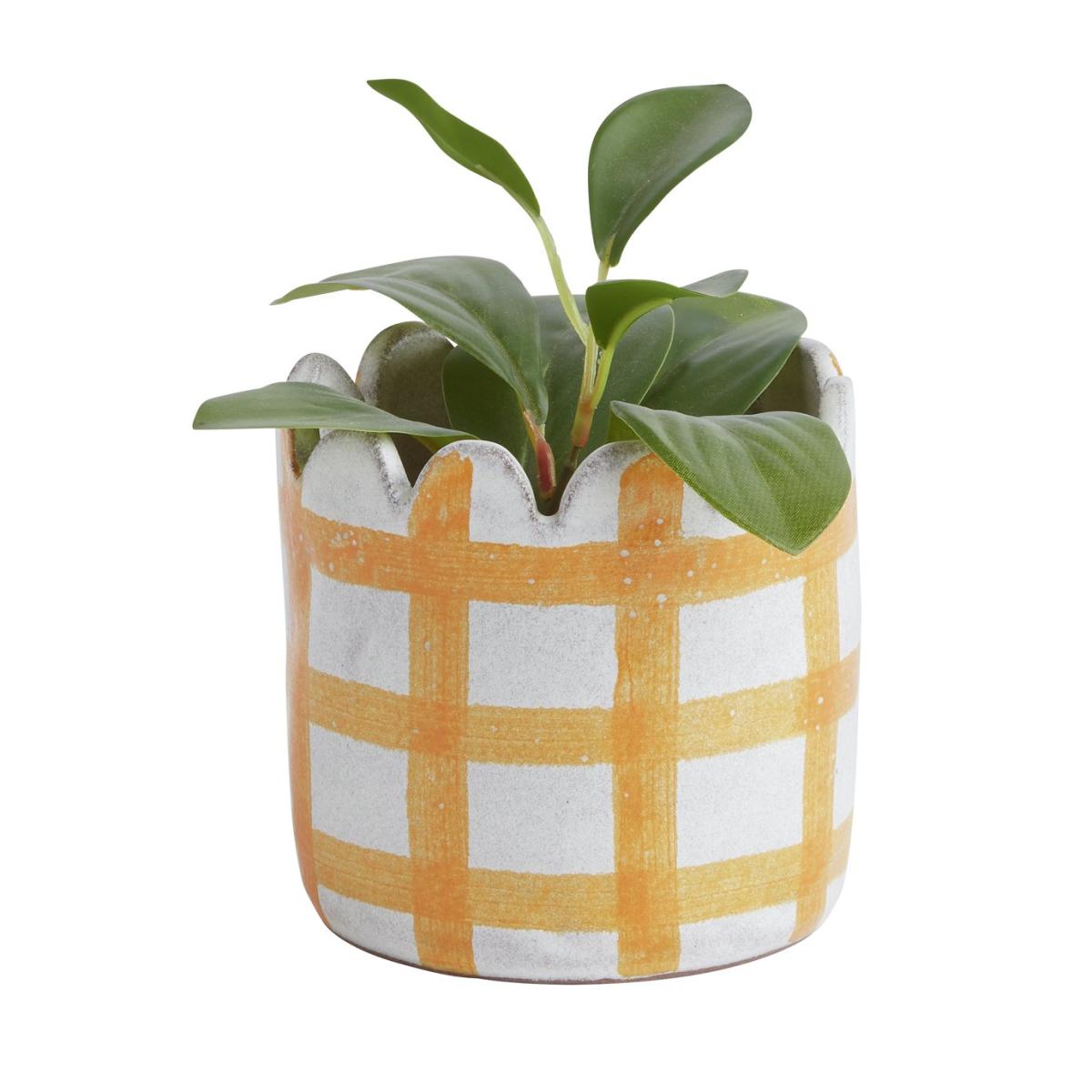 A sweet spot for any greenery. This pretty ceramic planter has a charming scalloped edge and features a fresh yellow and white check design. Vibrant and pleasingly vintage. Pop a lovely leafy plant inside and arrange on your lounge or kitchen windowsill. Just the ticket for adding a splash colour to your space.