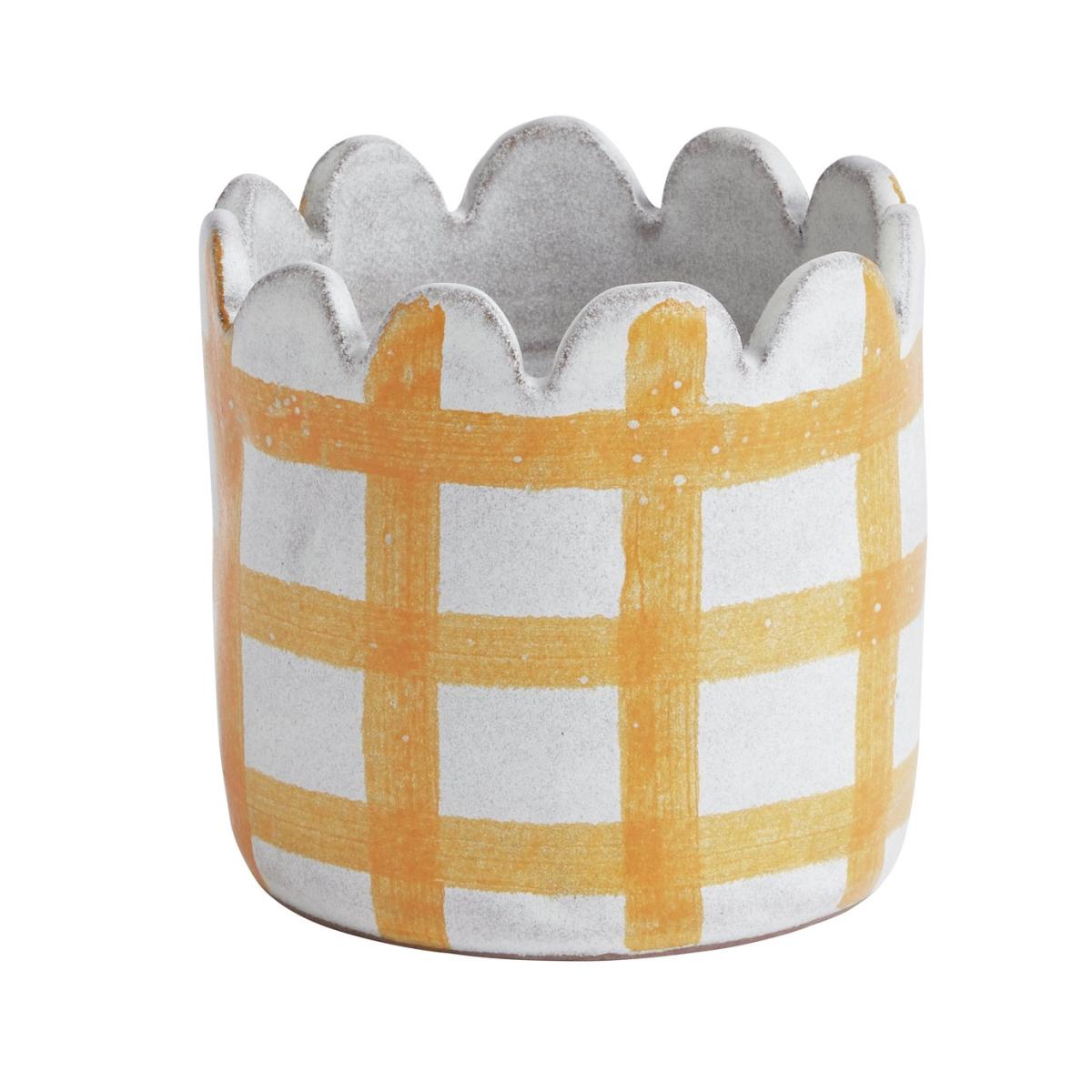 I love this little planter for its playful scalloped top and cheerful check pattern, which makes it a versatile addition to both modern and eclectic interiors. Its compact size is perfect for brightening up bedside tables, window sills, or workspaces. The white and yellow colourway adds a touch of freshness and can easily complement neutral schemes or be used to inject colour into more subdued spaces. To style it effectively, consider pairing it with trailing or small leafy plants like herbs or succulents. Its shape and pattern work well with minimalist greenery or layered with other textured Planters to create an inviting, vibrant display without overwhelming the space.