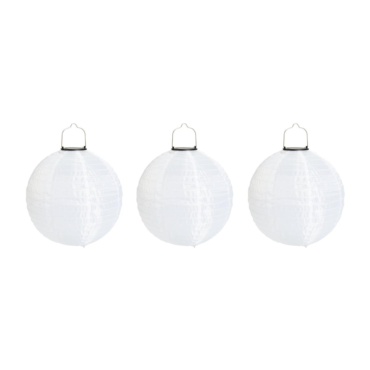 Bask in the soft white glow of these solar-powered fabric lanterns. Charged by daylight, they light up automatically at dusk, bringing up to 6 hours of warm, inviting ambience. Wireless and hassle-free, this pack of 3 is a simple way to brighten up your garden, terrace, or balcony. Composition: fabric. Solar powered. No wiring required. Automatically turns on at dusk. 6 hours run time if fully charged. 48 hours of full sun light required to fully charge battery. Battery is recharged via the solar panel. Batteries included (included). LED bulb (included). Size H30, W30, D30cm. Assembly required.