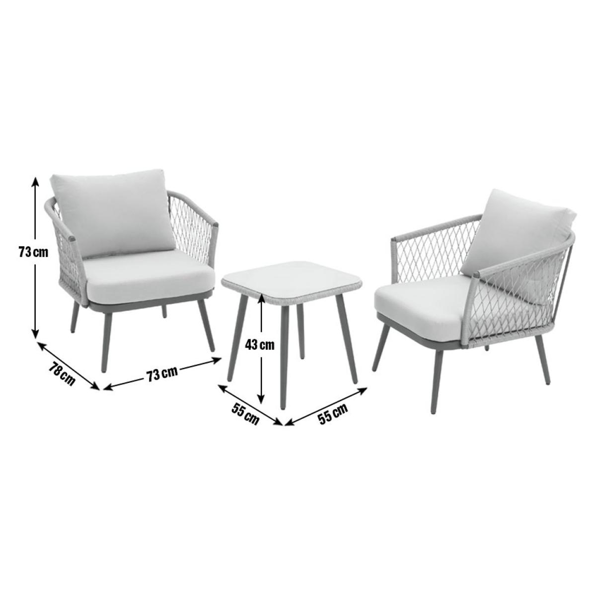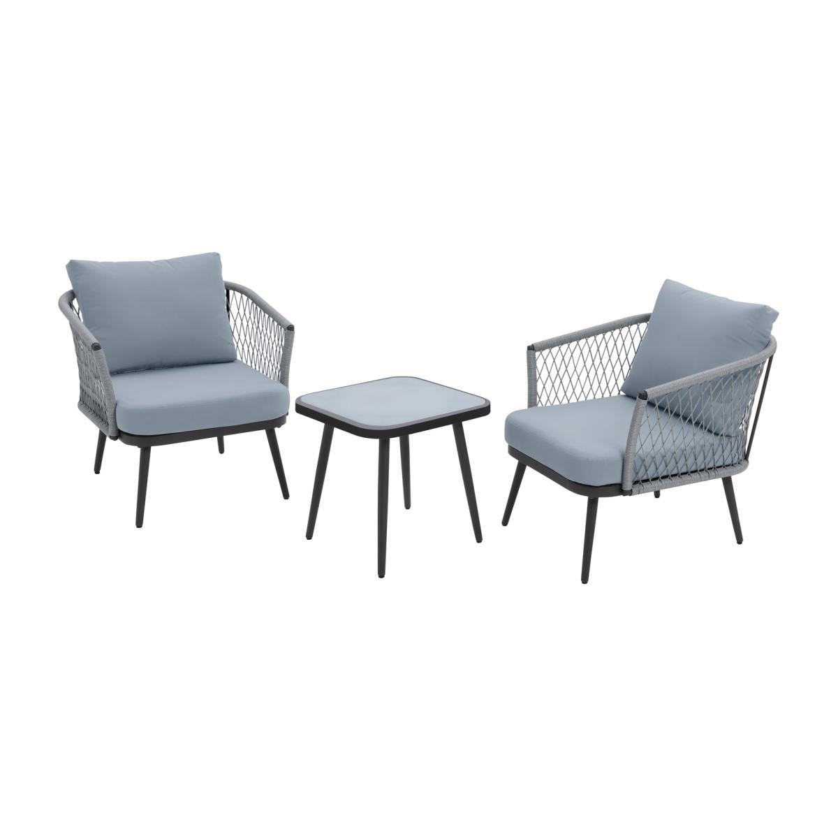 Cocktails or coffee? Take your pick and hunker down. Create a relaxing set up on your patio with this 2-seater bistro set. With a pair of comfy chairs and a matching glass top coffee table it's a great excuse for chilling out. Strong and smart. The frame is made from steel, and the grey rattan like rope is handwoven into a loose diamond weave. Comes with 4 cushions, all with removable, washable covers. Settle in and enjoy. Add a splash of colour to the chairs with some vibrant scatter cushions. And don't forget some cosy throws for cooler evenings. Make the most of summer nights by using warm outdoor lighting to create an inviting atmosphere. Take a look at our collection for designs you'll love. Parasol base not included. General features: Set seats 2 people. Set made from steel and rattan effect. Store inside when not in use. Cover or store inside in winter months to prolong life of the products. Total weight 27kg. Garden table features: Glass table top. Table size: H43, W55, L55cm. Removable legs for storage. Chair features: Chair seat and back made from steel. Size H73, W73, D78cm. Seat height 40cm. Seating area size W 58, D66cm. 110kg maximum user weight per chair. Parasol features: Parasol not included. Cushion features: Includes 4 cushions. Polyester cushion and grey cushions. Removable covers. Remove cushions when not in use and store inside. Packaging information: Package 1 size H66, W75, D81.5cm. Package 1 weight 30kg. General Information: Self-assembly - 2 people required. Manufacturer's 1 year guarantee.