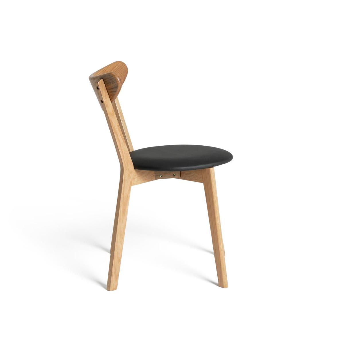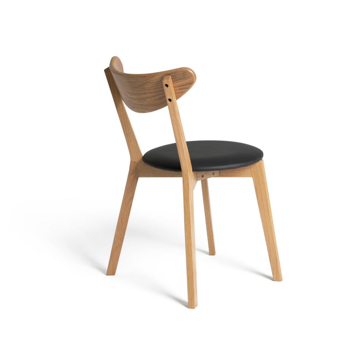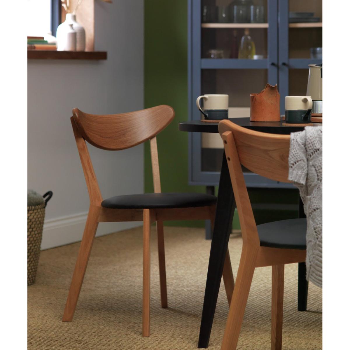 Straight from our designer's sketch book. These two Sophie chairs put comfort and craft at the top of the agenda. Natural wood and black is a classic combination. The fabulous mid century frame in 100% solid oak has a gently curved backrest and Skandi style legs. Look great as a spare seat in the lounge or pop them around a dining table. Softly padded for comfort, the faux leather seat encourages your guests to linger for longer. Two might not be enough.