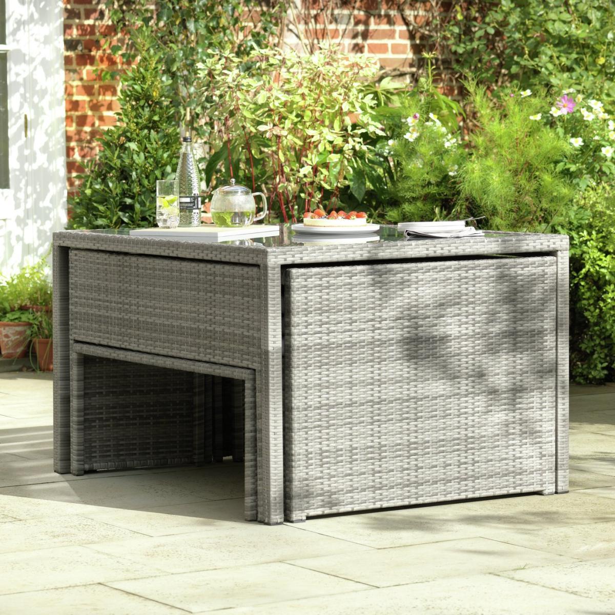 Table for 2, 4, 6 or 8? Welcome to the ultimate in flexible, foldaway outdoor dining. Our designers have had a field day with this stackable set of bistro garden furniture. Made for small gardens or balconys. It's a design classic with glass top, metal frame and rattan good looks.
