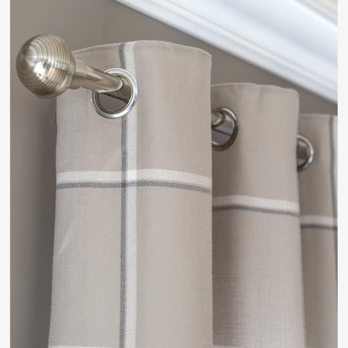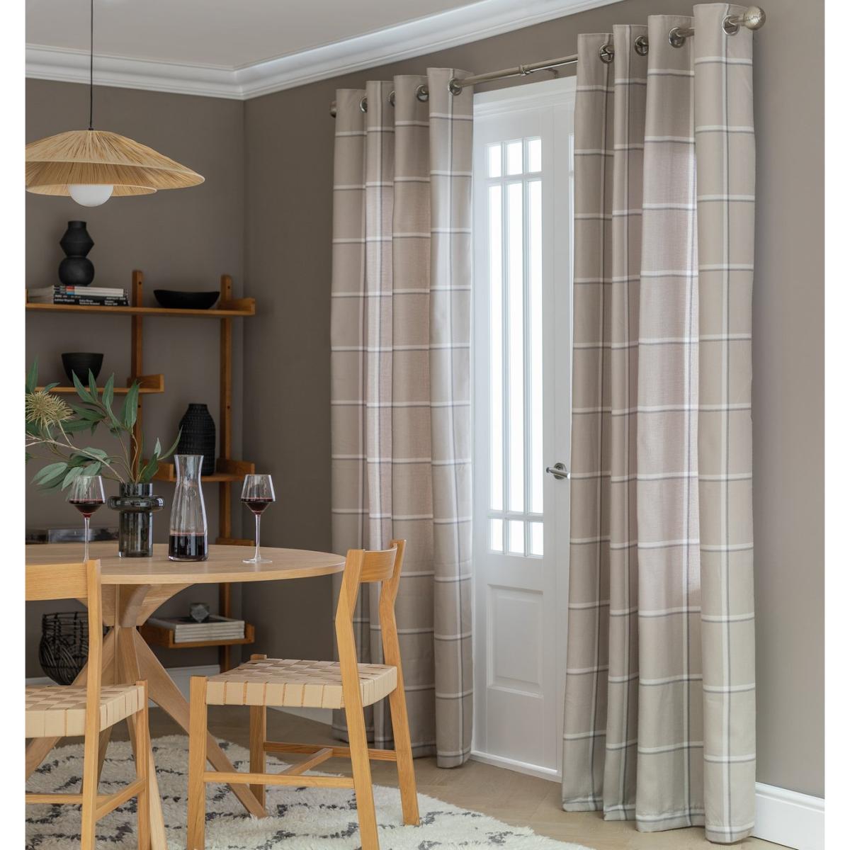 You'll want to hang out with this pair of modern check curtains. They'll bring a cool, calm look to a room. The grey and white wide checkered pattern against the neutral toned base gives this classic design a fresh feel. Fully lined and finished with easy to hang silver eyelets. Natural Check Design. Silver Stainless steel Eyelets. Features Fully lined. Made from 100% polyester. Lined. Lining made from 100% polyester. Dimensions Size 117cm (46 inches) wide by 137cm (54 inches) drop. Width refers to one curtain panel before hanging. Eyelet diameter: 4cm. General information Contains one pair of curtains. Number of eyelets per curtain: 6. Suitable for curtain poles. Curtain pole not included. Dry clean only. General Information: We are excited to be welcoming some of our favourite HOME products into the Habitat range. Your product may arrive in Habitat or HOME packaging. Manufacturer's 1 year guarantee.