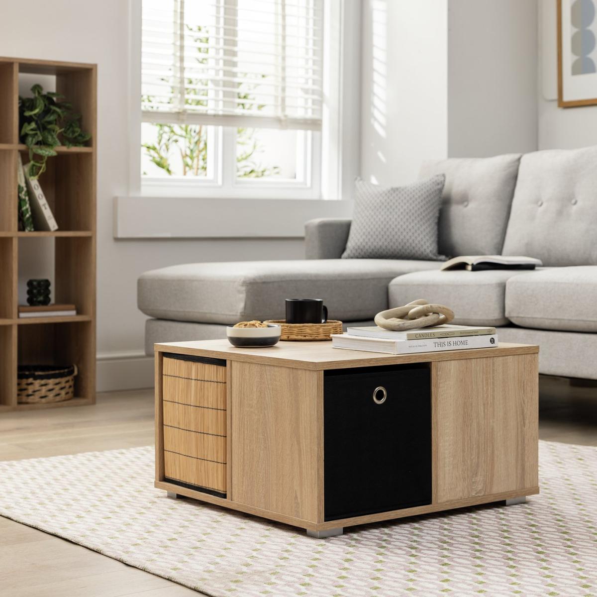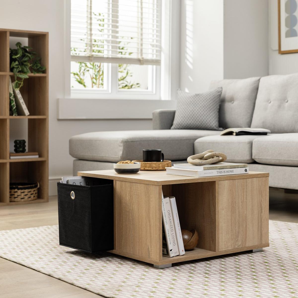 Enjoy the clean, minimalist lines and the look of a crafted finish with our Squares oak-effect coffee table. With a generous surface area and 4 storage cubbies that combine perfectly with baskets and boxes from our optional Squares storage collection. Or simply leave them open for games and everyday items. Hardworking and hardwearing with an easy-wipe surface. Coffee table couture. Part of the Squares collection. Size H 34.8, W 61.2, D 61.2cm. Made from particleboard. 4 undershelves. Weight 16.5kg. Self-assembly - 1 person recommended. Maximum load weight 15kg. Package Dimensions: Package 1 dimensions: H7.4, W62.7, D68.2cm. Package 1 weight: 17.5kg. General information: Manufacturer's 2 year guarantee. FSC certified meaning the materials used for this product are responsibly sourced.