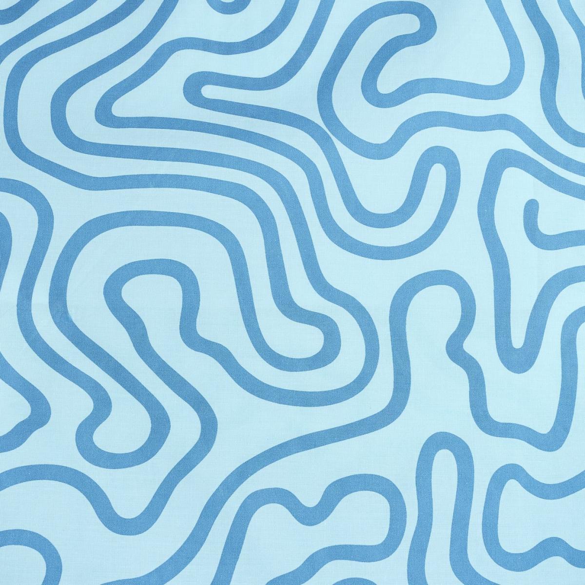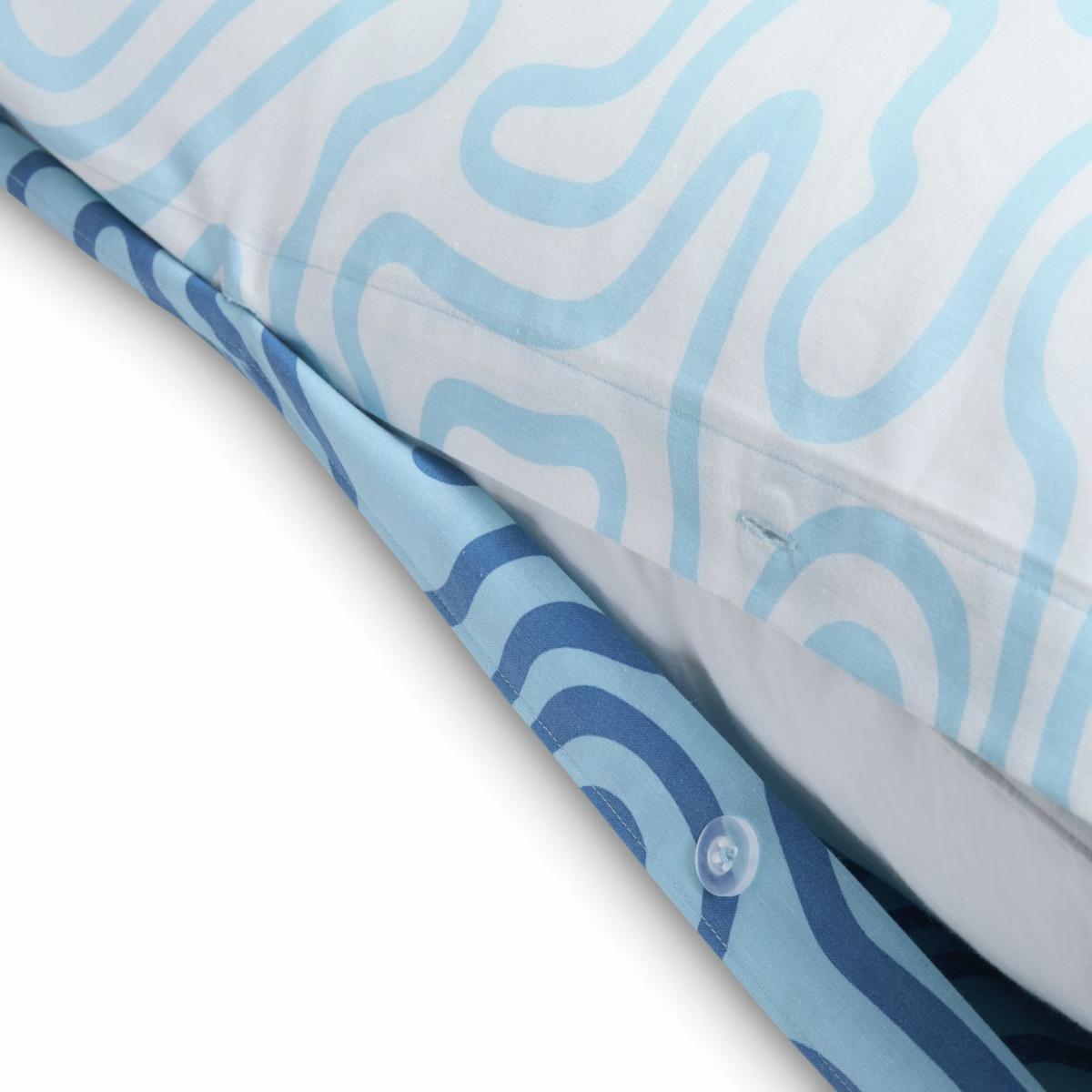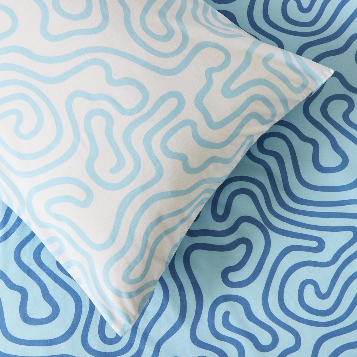 Get ahead of the curve with this striking squiggle bedding set. The contemporary design and limited colour palette create a softly stylish look for a double bed. And it's reversible, so you have choices. Showcase the blue on blue side, or the blue on white. Set comprises of 1 duvet cover and 2 pillowcases. Blue and white. Size L200 x W200cm. Pillow case length 75cm, Width 50cm. Standard pillowcase (s). Reversible pillowcase (s). Reversible. Buttons for fastening. Machine washable at 40 C. Suitable for tumble drying. 52% recycled polyester, 48% cotton. 144 thread count.