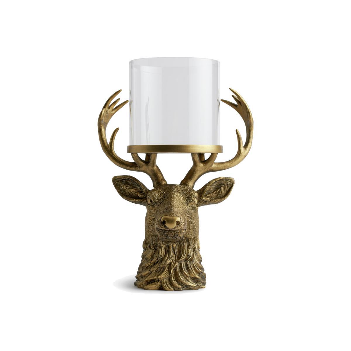 Strike gold with our stag head candle holder. This beautifully crafted figurine has a luxurious metallic finish to bring a touch of elegance to your sideboard or dining table. Pop a candle in the holder nestling between its impressive antlers, light up and enjoy the effect. Magical. With its intricately etched features it's a stunning statement piece. Size H31, W22, D16.5cm.