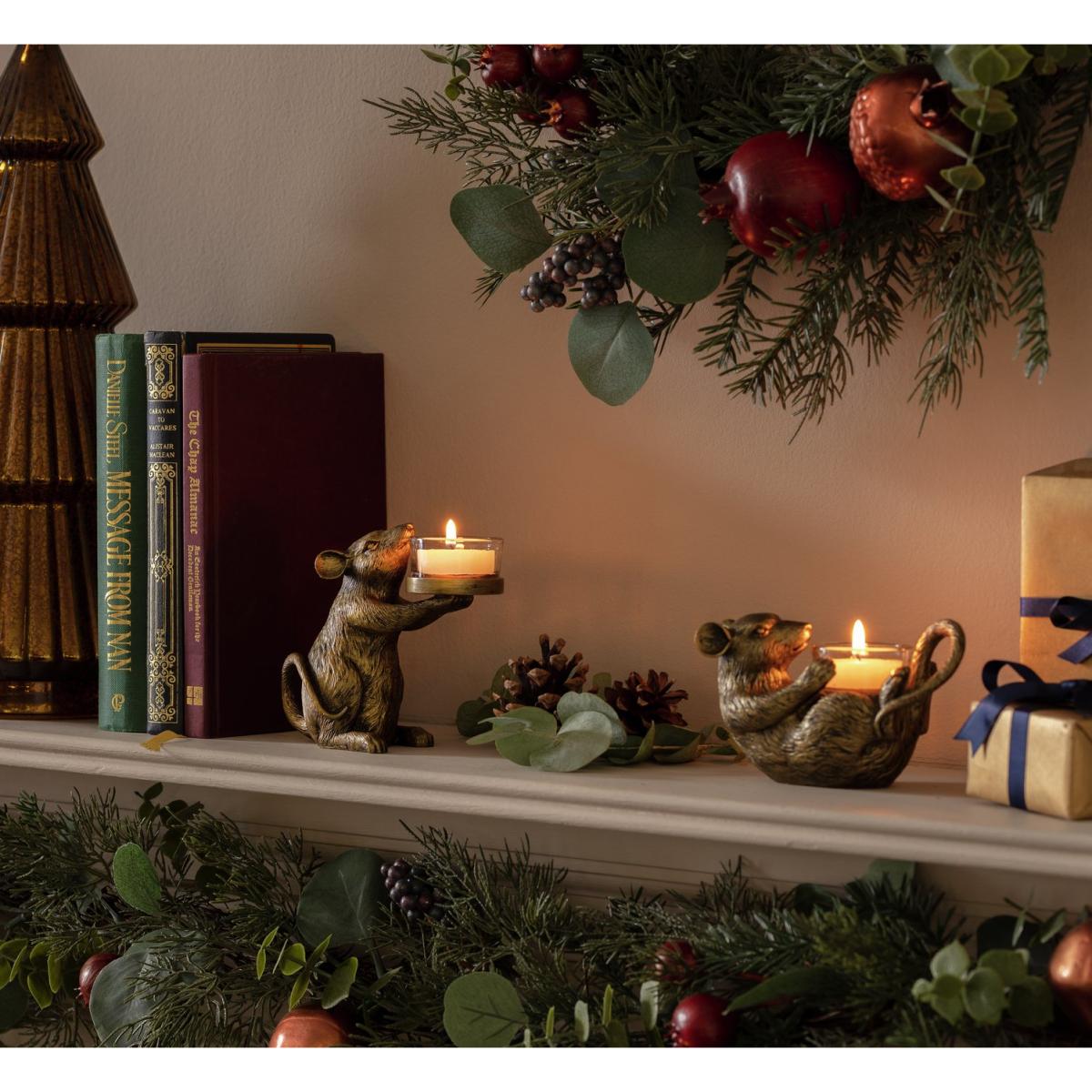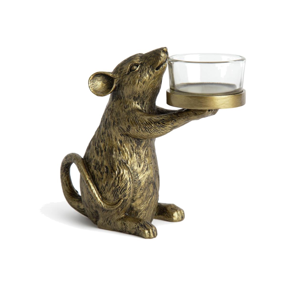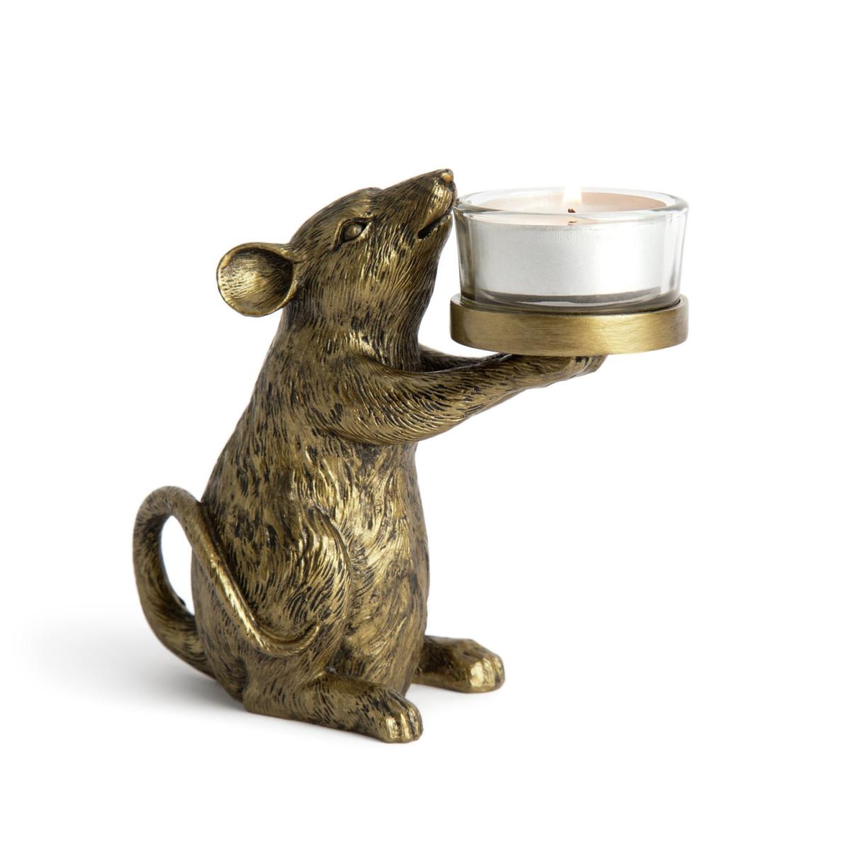 When the cat's away.... This playful resin tealight holder glows with warmth and personality. Charmingly lifelike, this country mouse has a burnished gold finish etched with tiny textured fur like strokes. So sweet. Pop a tealight in the glass container and he'll hold it for as long as you like. How about some instant winter ambience? Arrange one or two on a mantle or as a table centre piece. Cute. Size H11.2, W17.5, D16cm.